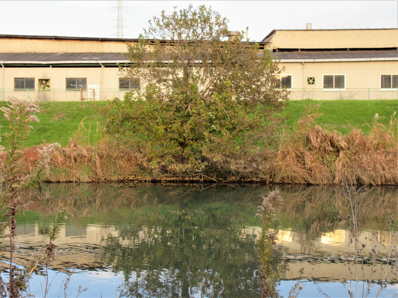 秋は、河川敷の草花は枯れて、背の高いカヤが秋の穂をゆらゆらさせています。