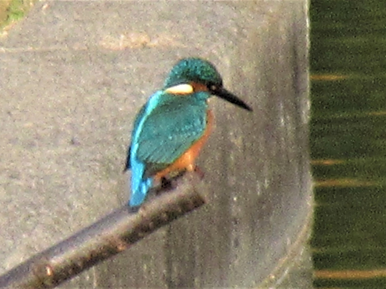 その先を見ると、池に突き出した木の枝の上にカラフルな小鳥が止っていました。たぶん「カワセミ」です。サッと水に飛び込んだかと思うと、もとの枝に戻って口に何かくわえていました。