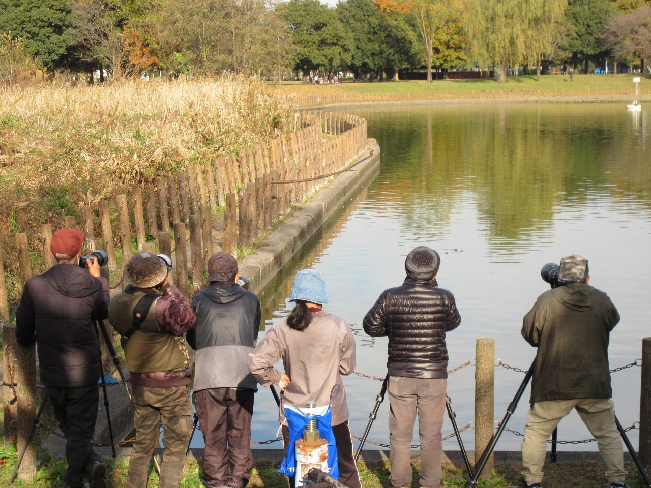 池の周囲に望遠レンズを付けたカメラの3脚の列ができていました。