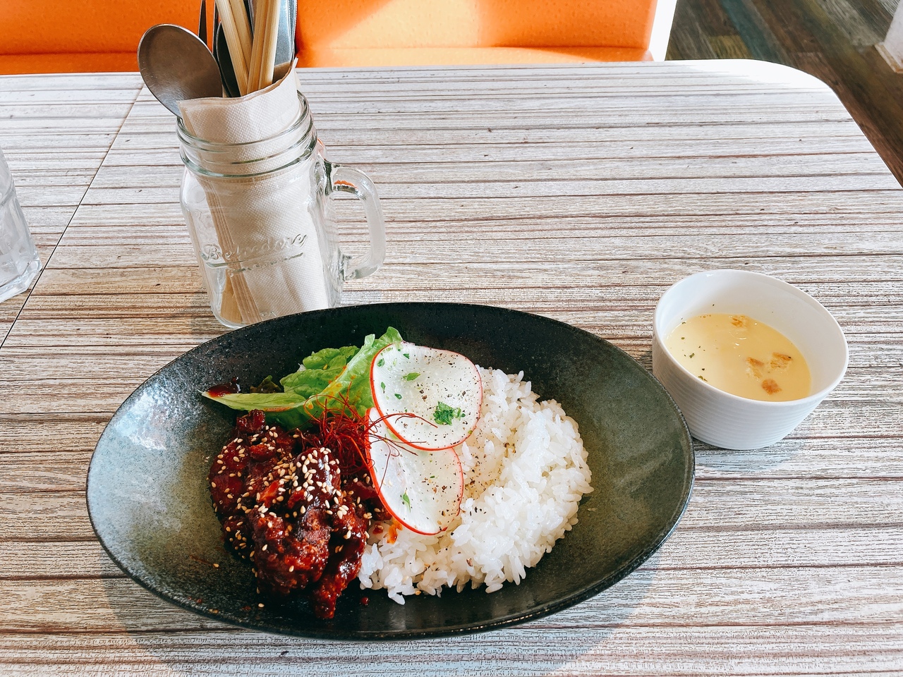 まずサラダが出て来てその後スープとメインが登場。サイズは女子サイズながら味はなかなか良い。特にヤンニョンチキンがしっかり辛いのが良かった。赤大根のサラダもなかなか。