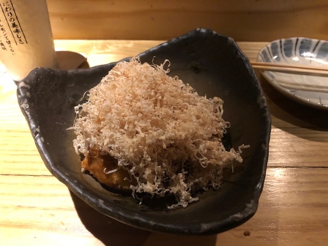 三角形のおしゃれな器に小さめの丸いコロッケが3個入って、上に細かい削り節がたっぷり。