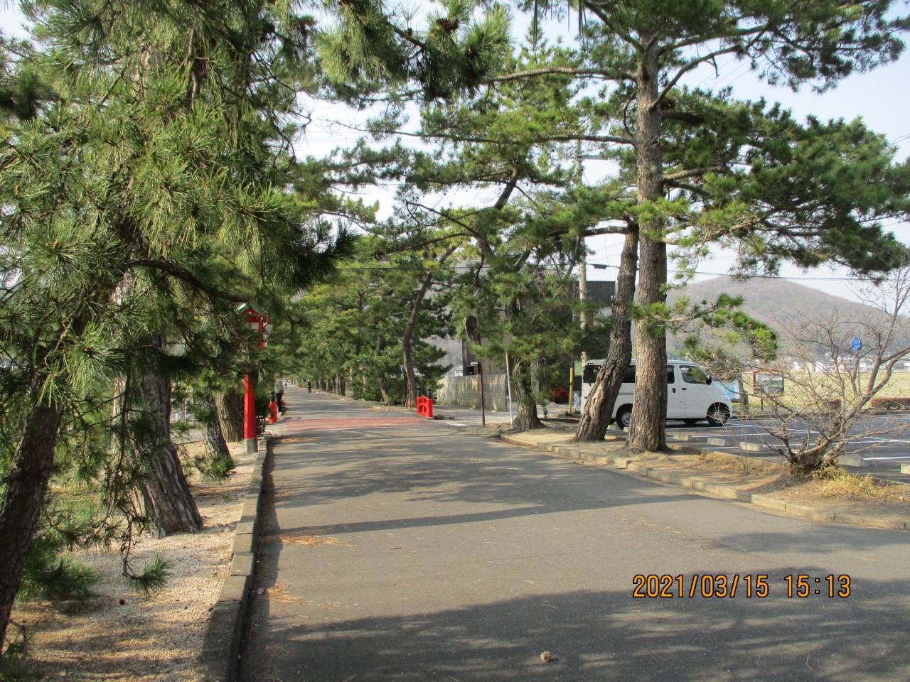吉備津神社へ向かう途中、松の並木の横を車で通り、駐車場へと行きました。この松並木が吉備津神社の参道の入り口になるようです。車で行ったのですが、松並木の中を歩いてみたいとおもいました。県下最大級の松並木で、郷土記念物に指定されているそうです。