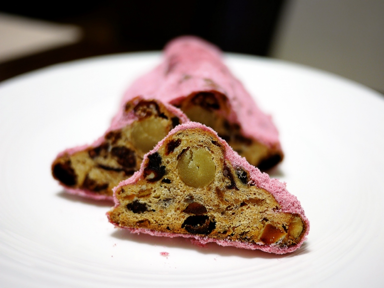 フランボワーズの粉糖を塗して仕上げたピンクのシュトーレンは、甘酸っぱいベリー感が特徴的。