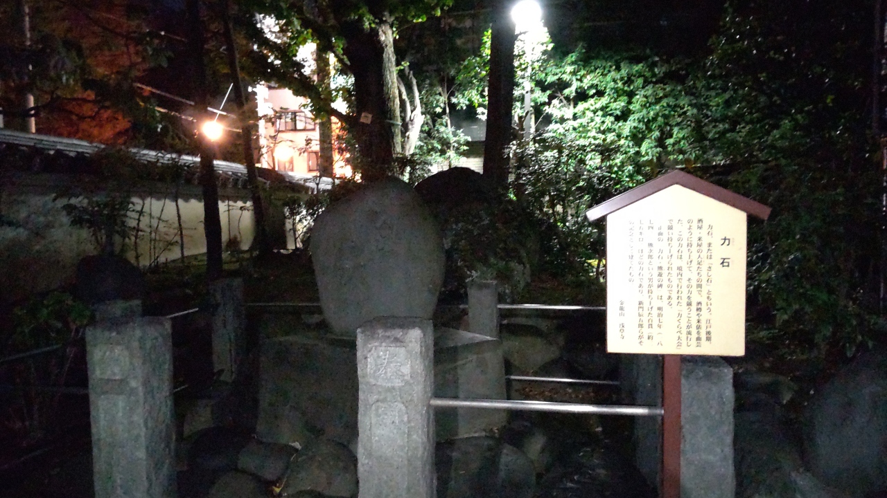 力石は、浅草寺の境内にあります。江戸時代の後期に、酒屋、米屋の人足たちの間で、酒樽や米俵を曲持ち上げて持ち上げて、その力を競うことが流行した。この力石は、境内で行われた「力比べ大会」で競い持ち上げられたものとのことです。この重さは100貫(約375キロ)とのことです。すごい重さです。