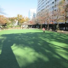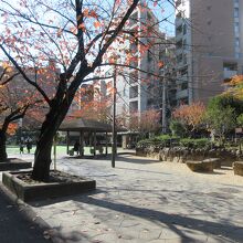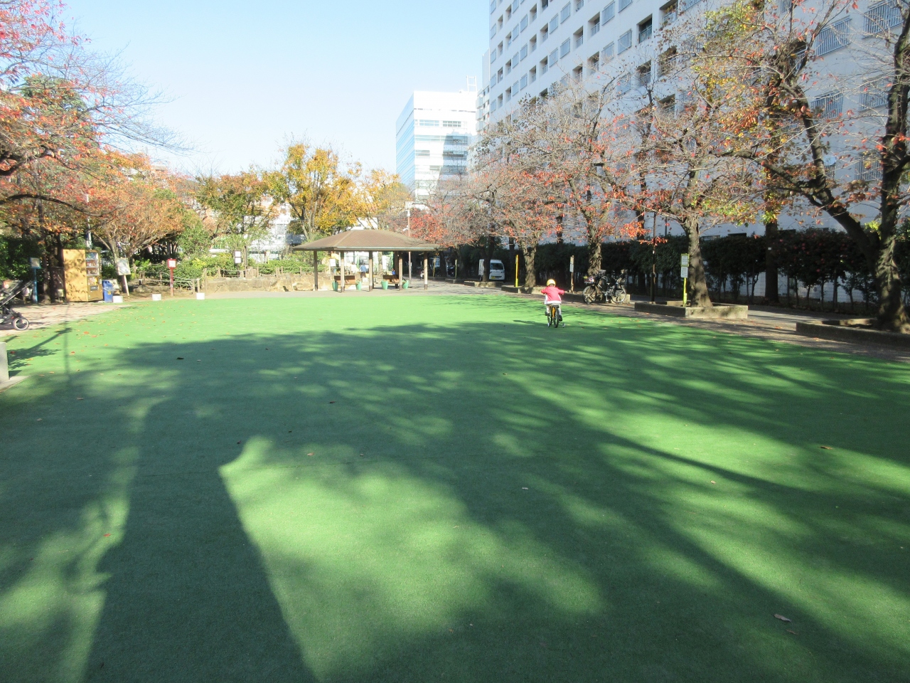 天現寺橋交差点から70mほど、明治通り沿いに造られた公園です。人工芝が敷き詰められた広場と、すべり台やブランコ、砂場がある幼児のための公園とに分かれています。夏には水が流れる親水施設や東屋、ベンチも設置されています。公園の周りには桜が20本近く植えられていて、桜の季節は見ごたえがあると思いました。12月の始めに訪れたため、紅葉もほぼ終わっていて、落ち葉が公園中に広がり落ちていました。