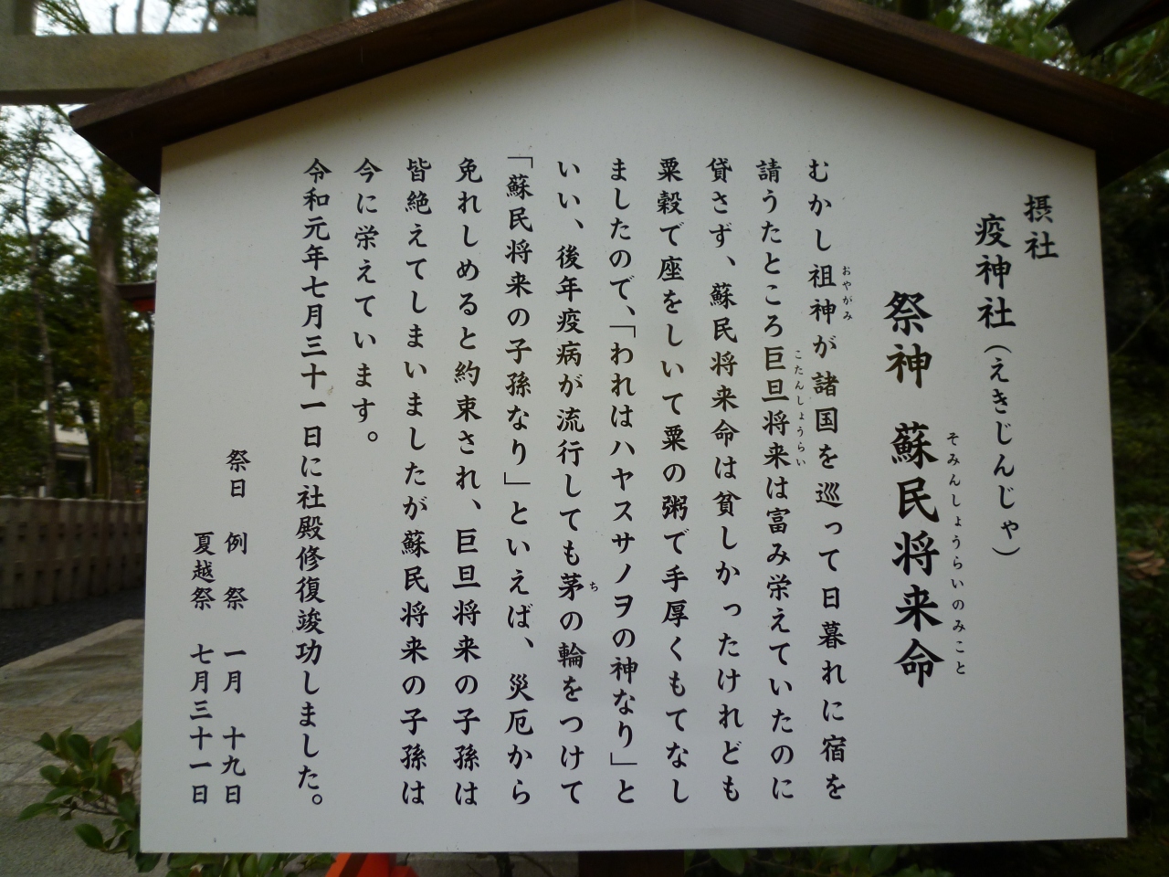 疫神社は、八坂神社の摂社です。御祭神は「蘇民将来」です。1月19日に例祭が行われ、7月31日に夏越祭(祇園祭のフィナーレ)があります。昔、祖神が諸国を巡って、日暮れに一夜の宿を求めたところ、富み栄えていたにも関わらず巨旦将来(蘇民将来の弟)は宿を貸さず、貧しかったけれど心根の良かった蘇民将来は宿を貸した上に粟の粥で手厚くもてなしました。その時に祖神は、「われはハヤスサノヲ(速須佐雄能神)の神なり」といい、後年疫病が流行しても茅の輪をつけて「蘇民将来の子孫なり」と唱えれば、災厄から免れしめると約束しました。後に、巨旦将来の子孫は皆途絶え、蘇民将来は疫病にも無事で栄えたと伝えられています。