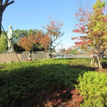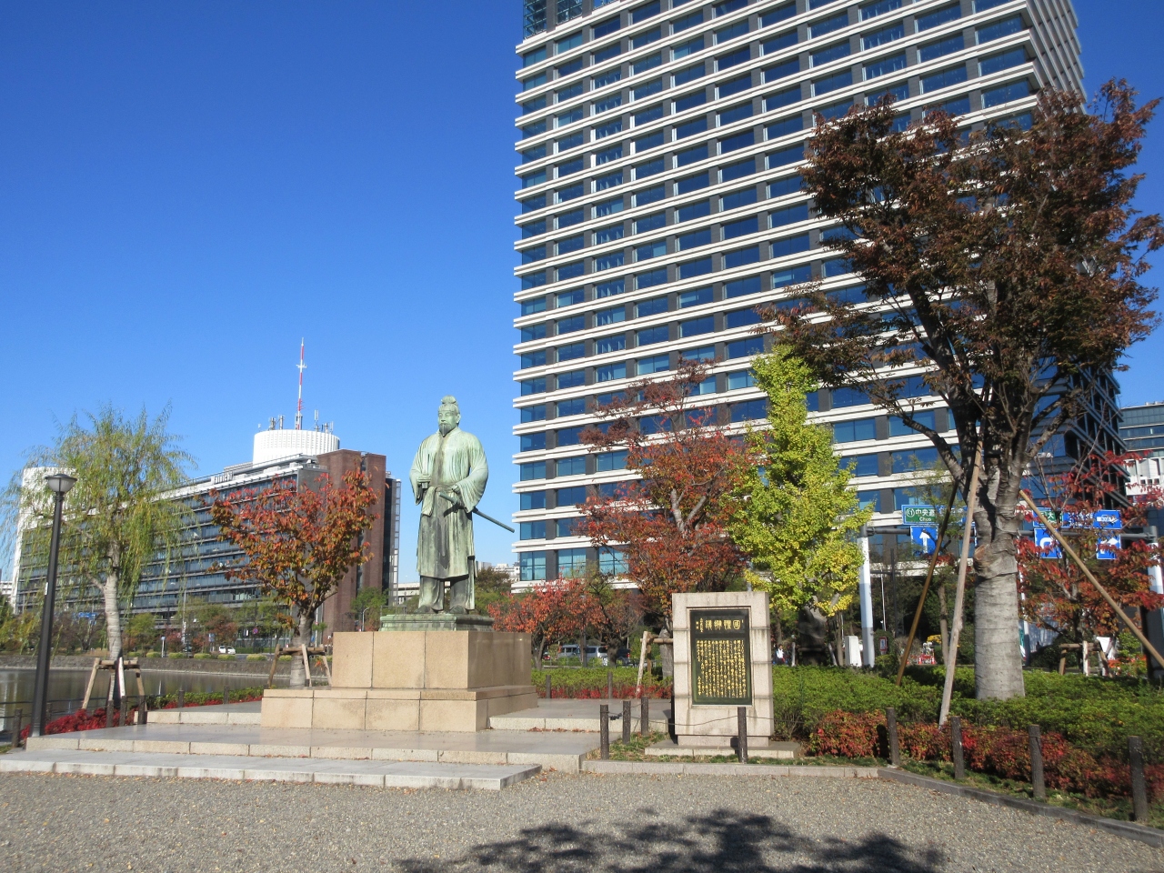 東西線・竹橋駅2番出口を出たところに造られている緑地です。3年ほど前に訪れた時は工事中だったため、今回近くを通りかかった際に立ち寄りました。交通量が多い内堀通りに面しているものの、反対側は大手濠に面し、敷地には小石が敷き詰められ、木々は赤や黄色に色づき落ち着いた雰囲気が感じられました。緑地内に建つ和気清麻呂像の写真を撮りに来ている人も見られました。駐輪場ではないにもかかわらず、通勤で竹橋駅を利用する人の自転車が数台駐輪していたのが残念でした。
