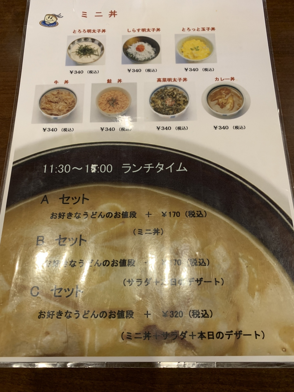 カレーうどんが美味しいのはみなさんわかっている通り、しかもランチの時間には7種類ほどあるミニ丼が半額になります。