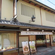四条通の壬生寺道バス停から南へ200mほど歩いたところにある壬生寺の北側にある和菓子店です。通りに面した店は和菓子店ですが、新選組発祥の地八木邸の拝観券受付と新選組グッズ販売を行っています。店内で和菓子を見ていたら、やわらか抹茶サブレの試食をすすめられました。美味しかったので土産に京ちゃふれと小さいここを購入しました。しっとりとして柔らかい抹茶の焼き菓子です。子どもにも好評でした。