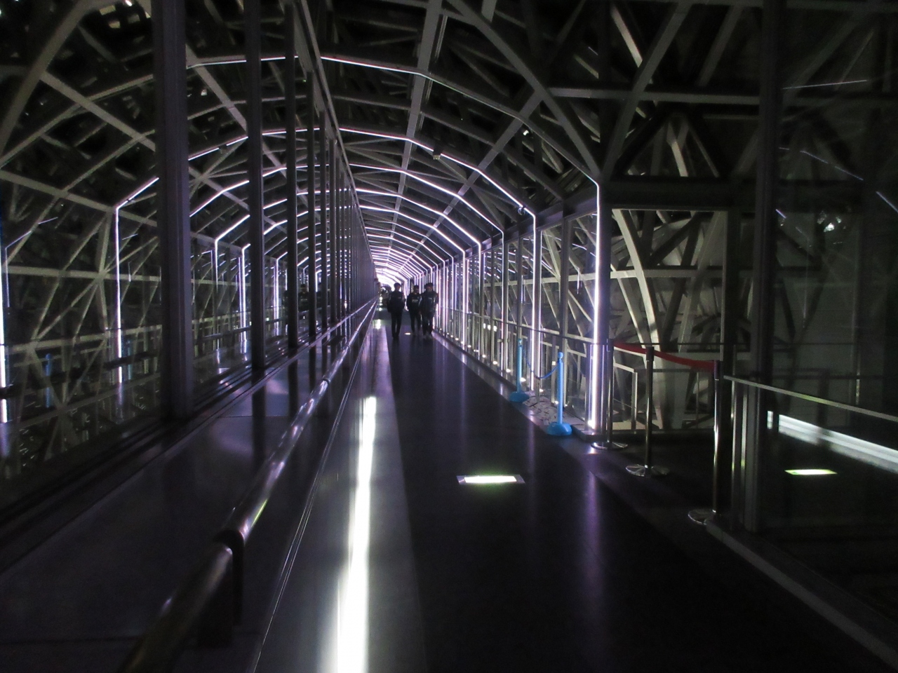 京都駅ビルのインフォメーションで行き方を聞きました。1階からエスカレーターを乗り継いで7階の東広場に出て、7階から長いエスカレーターで10階に上がると空中かい路SKYWAYに出ます。烏丸方面のビルが眺められる長い透明なトンネルのような通路を歩いていくと京都拉麺小路に出ます。夜通った時は白色LEDが流れるように照らし、不思議な空間を歩いている気分になりました。いくつかのパターンがあるようで、長い通路を歩いても飽きませんでした。通った後で外から空中かい路を見ると、赤色LEDになっていました。遊び心が楽しい通路です。