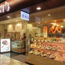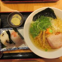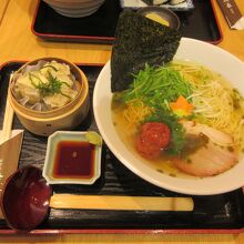 京都駅中央改札口を出て地下へ降りるとポルタがあります。西エリアのレストラン街で夕食にしようと訪れました。さっぱりした麺類を食べたくて、京阿月に入りました。白だしラーメンとおにぎりセット、梅しそラーメンと湯葉しゅうまいを注文しました。細麺がさっぱりした白だしスープに合っていて、観光で疲れた身体に優しかったです。セットのおにぎりは2個で、梅とこんぶにしました。ご飯をふわっと握ってあるので量はちょうどよかったです。妻が食べた梅しそラーメンも白だしスープで、柚子胡椒のタレが浮かんでいました。梅肉が疲れを取ってくれたようです。湯葉で包んだしゅうまいはわさび醤油でいただきました。美味しかったです。