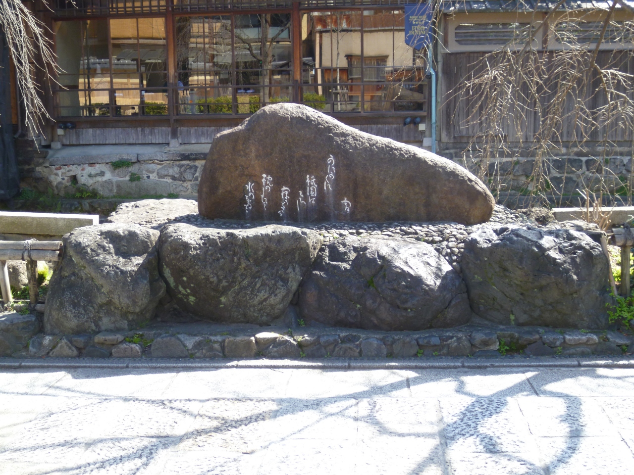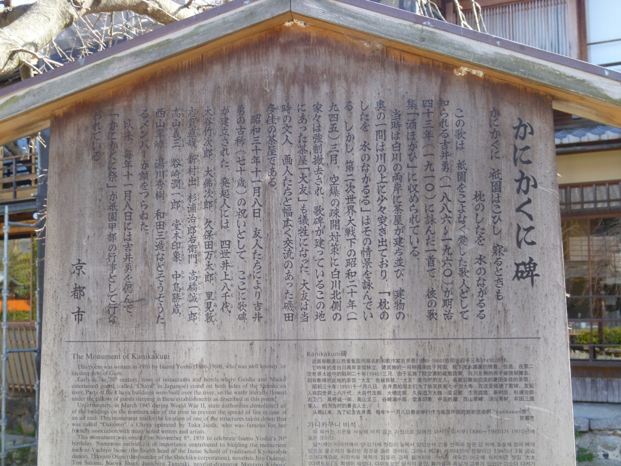 祇園の巽橋から100メートルほど西に進んだところにあります。歌碑の歌は,祇園をこよなく愛した歌人として知られる吉井勇が明治43年(1910年)に詠んだ一首で,彼の歌集「酒ほがひ」に収められています。昭和30年11月8日,友人たちにより吉井勇の古稀の祝いとして,ここに歌碑が建立されました。毎年十一月八日には吉井勇を偲んで,「かにかくに祭」が祇園甲部の行事として行なわれているそうです。