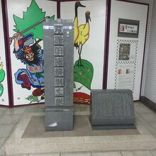 烏丸御池駅構内の改札出口前にありました。色鮮やかなイラストの屏風の前に磨かれた石碑が建っていました。屏風の横に「京すりものここに始まる」と書かれ、細かい説明がありました。隣の石碑に説明が彫られていました。活版印刷技術が長崎で始まり、1870年京都に開業したことなどが記されています。これらの石碑は2010年に建立されました。目に入った屏風は、一瞬どこかの宣伝かと思いました。石碑を引き立てるものだと気づきました。