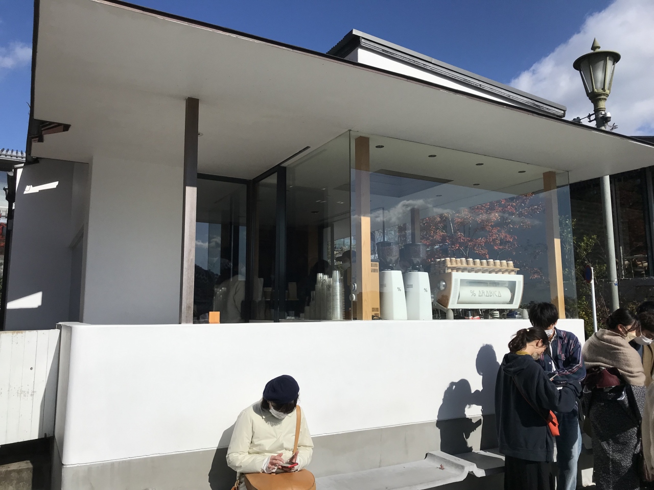 アラビカ京都 嵐山は、保津川沿いにある、絶景を望みながら美味しいコーヒーが飲める店です。コーヒー豆や挽き方はもちろんのこと、ミルクも原料から産地に至るまで厳選していることもあり、ラテの美味しさは口コミで噂が広がるほど有名です。京都の東山にフラッグシップストア「% Arabica 京都」を2019年9月にオープンし、嵐山店は2020年7月にオープンしています。白を基調としたコーヒーショップです。