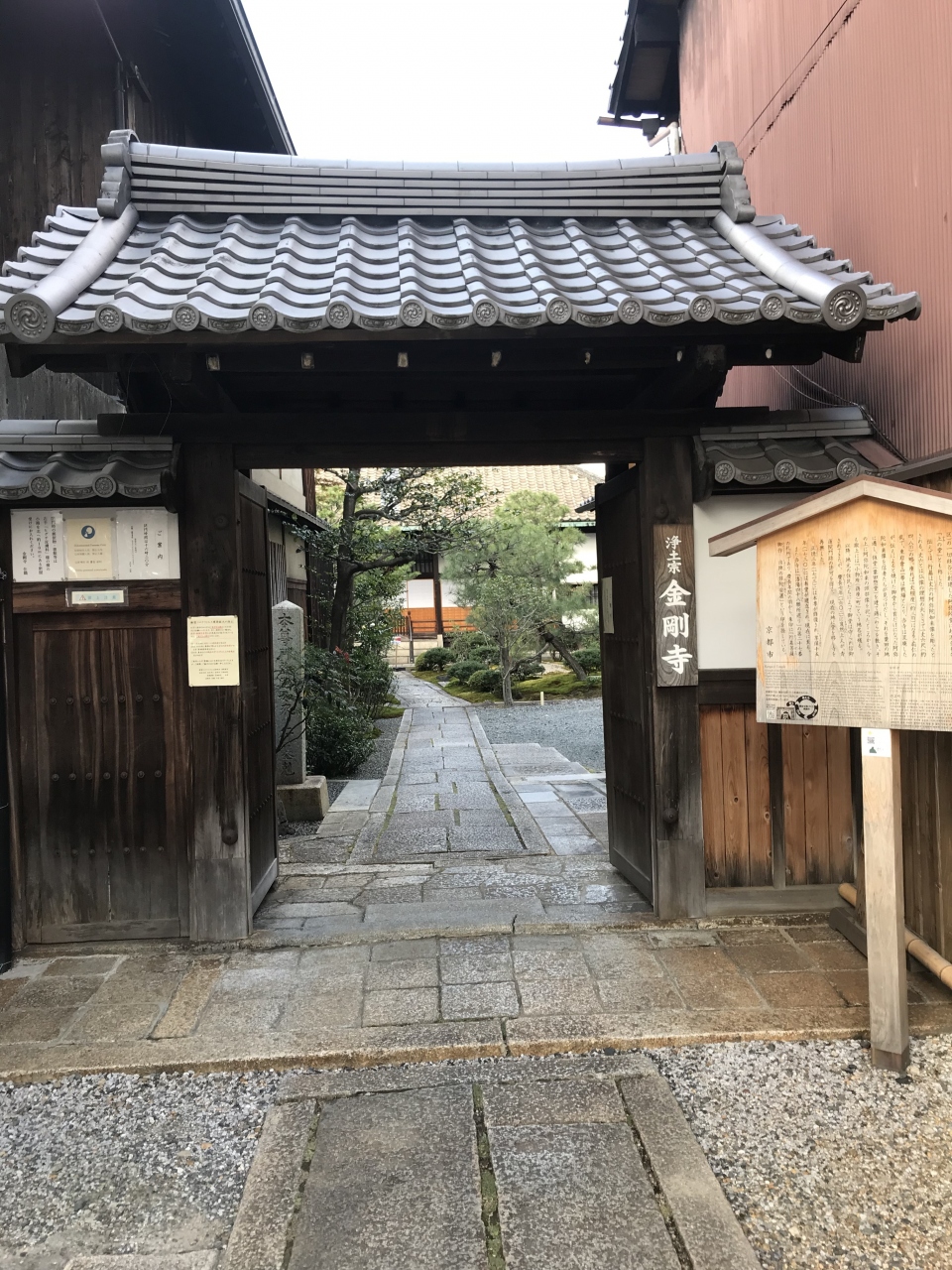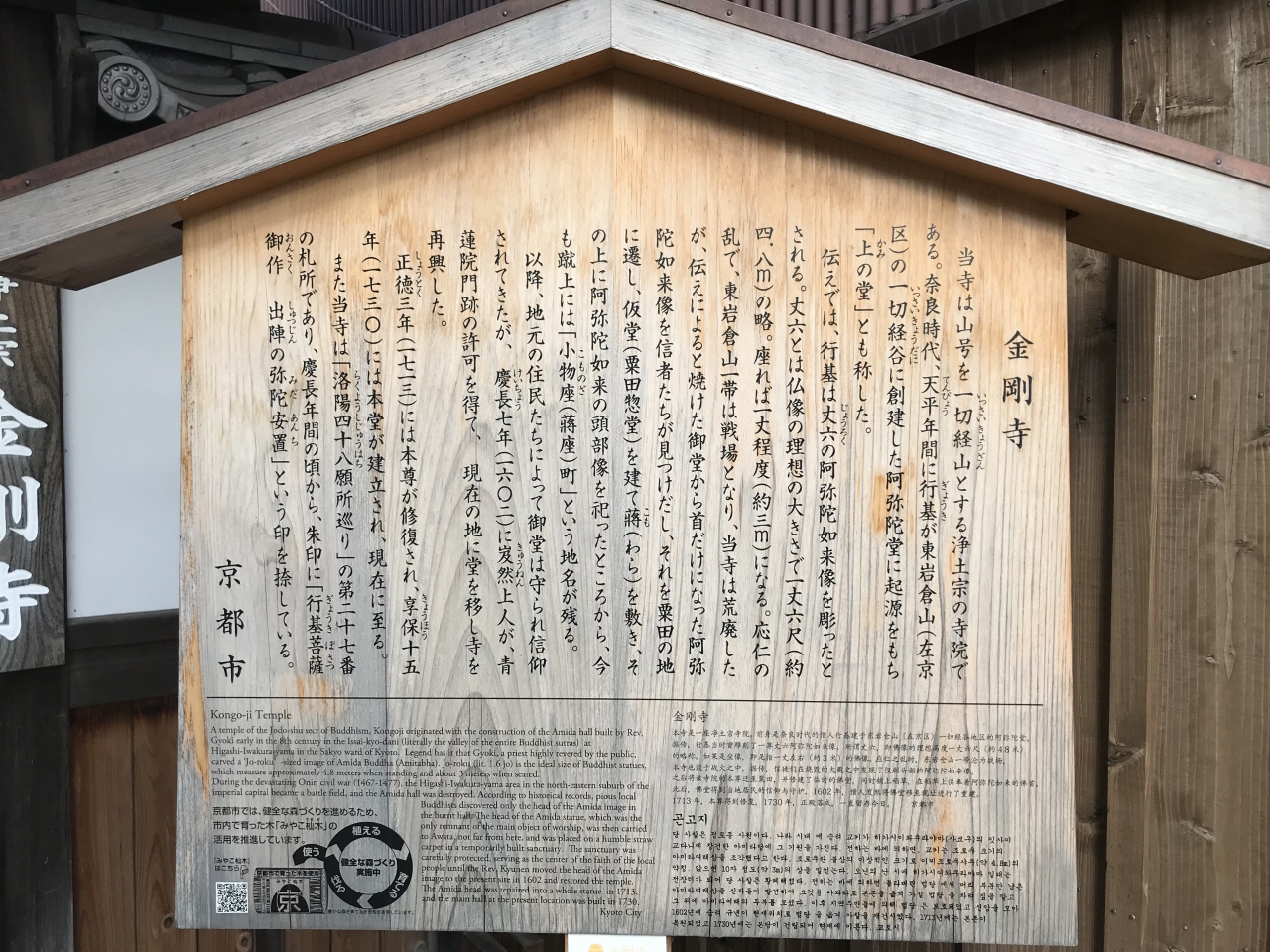 金剛寺は、地下鉄「東山」から東へ徒歩2分くらいの場所にある浄土宗の寺院です。ご本尊は、丈六の阿弥陀如来像。奈良時代、行基が東岩倉山(左京区)の一切経谷に阿弥陀堂を創建したのが始まりです。行基は丈六の阿弥陀如来像を彫ったと伝えるが、応仁の乱で東岩倉山一帯は荒廃し、丈六は首だけになりました。これを信者が見つけ出して粟田の地に仮堂を立てて祀りました。1602年、岌年上人が再興し、1713年に本尊が修復されました。