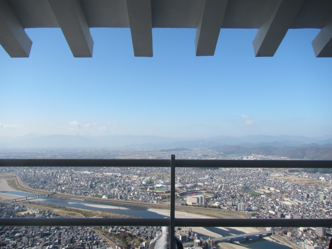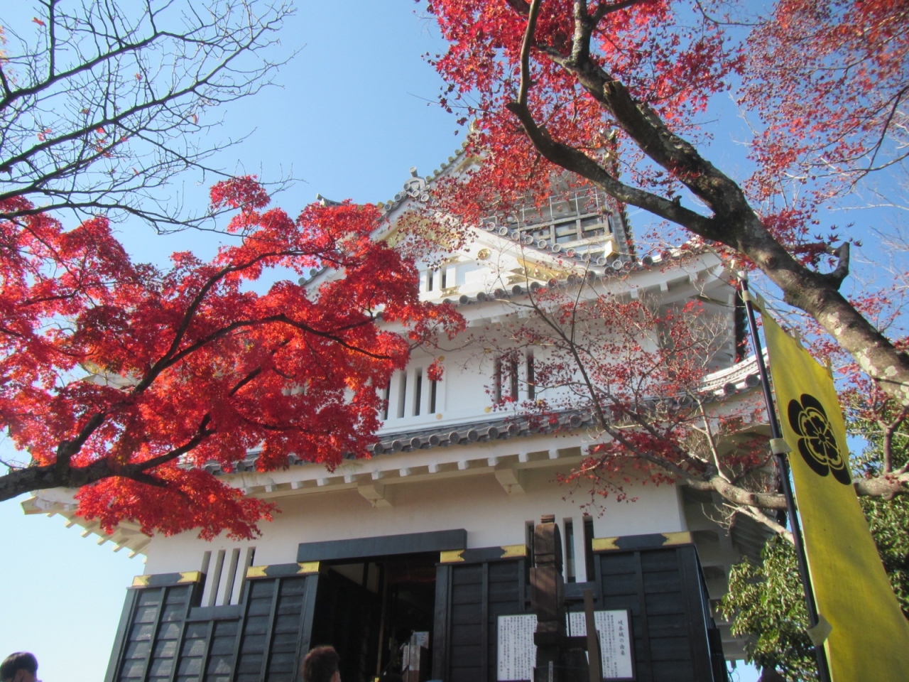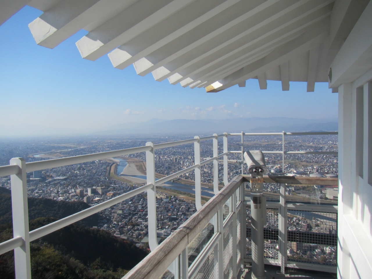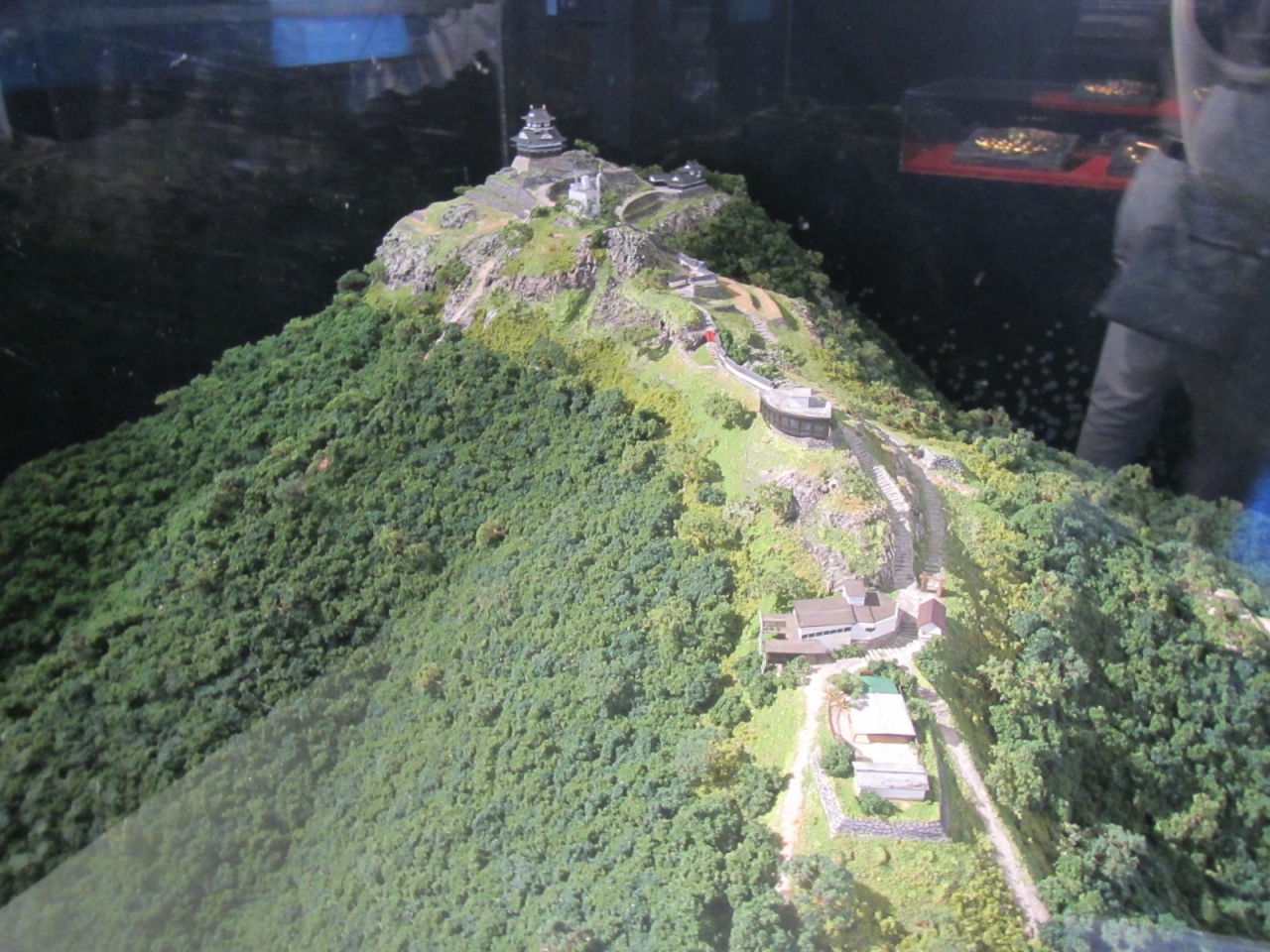 果たして到着した山頂部では、まず標高280mほどの地点にロープウェイの山頂駅とリス村(入場料¥200円)があり、そこから天守閣へは山上尾根の細道を約7分(距離290m)ほど行くと到着です。途中、展望台に寄るのがおススメで、できれば入場待ちがあるお昼時を避けて直下のレストランを利用すると、大展望を前にゆっくり椅子に座って寛いで美味しい食事をいただけます。