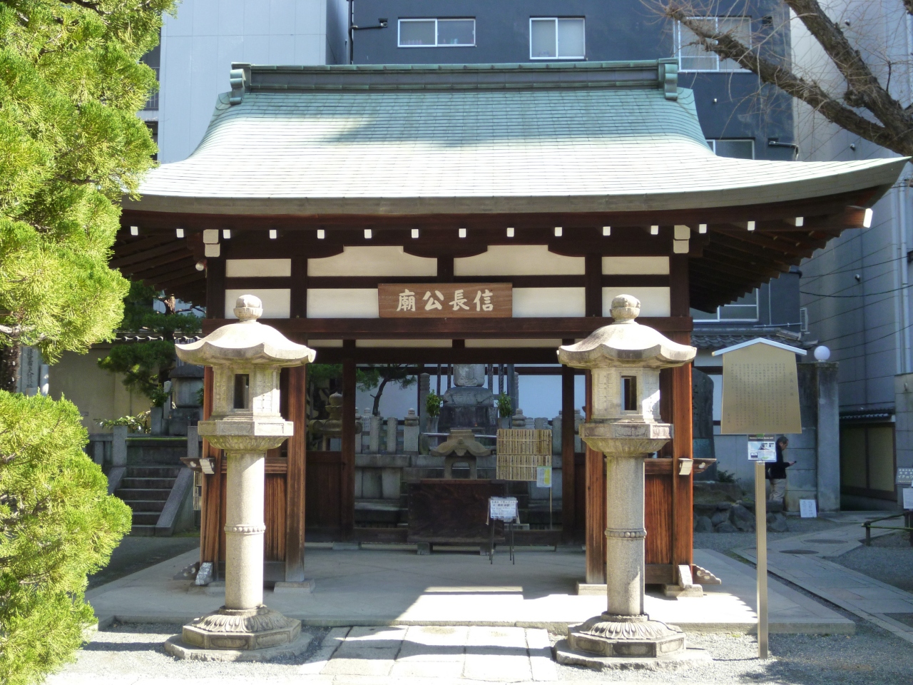 境内には織田信長をはじめ、森蘭丸ら信長の側近達の供養塔や、江戸後期の南画・家浦上玉堂父子の墓などがあります。境内南東にある「火伏せのイチョウ」は天明の大火に際に猛火に追われた人々を救ったと伝えられている由緒ある木です。6月2日には本能寺の変の戦没者の法要が行われています。