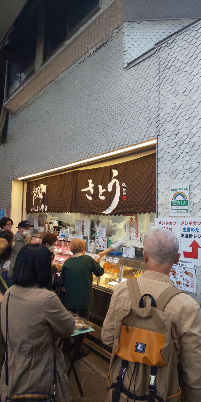 たいていのみなさんは、メンチカツ、コロッケ、串カツなどの揚げ物メインです。とくにメンチカツは肉汁がすごくあふれておいしいのでよく買います。この日も並んで買いましたが、並んでも食べたいおいしいメンチカツです。