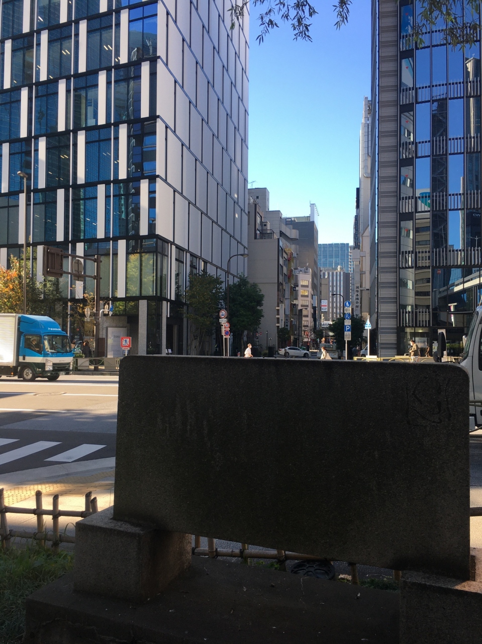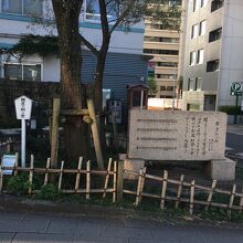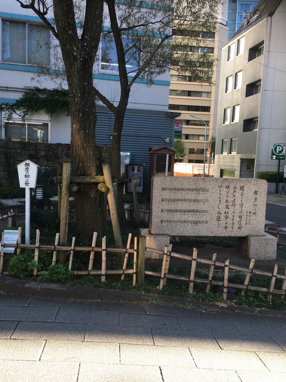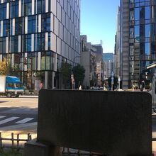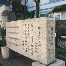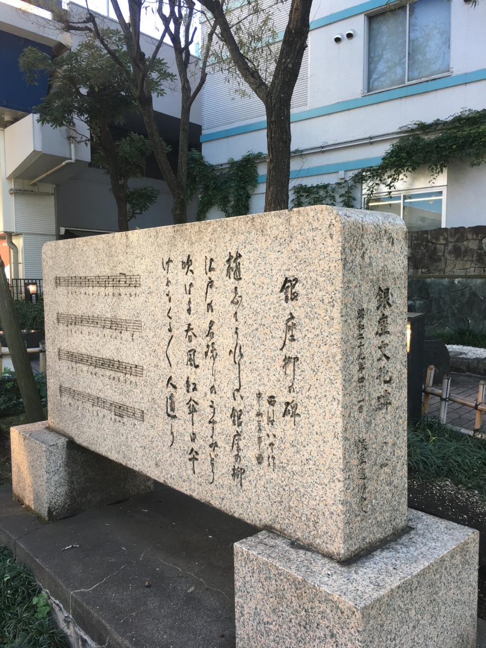 人通りが多い場所にあり、竹で囲まれた木の下にありました。左右の土台の上に立ち、長方形の石碑で、音符が描かれていました。碑の裏側は何も記載がなかったです。表の音符の右側には歌の記載があり達筆な字で、作詞、作曲者の記載もありました。