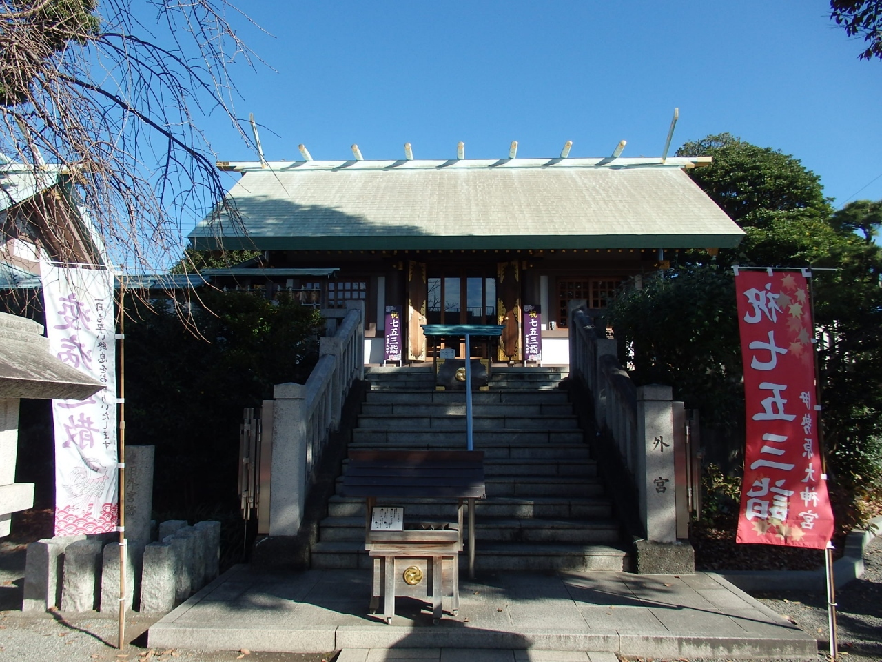 創建は1620年、伊勢の山田曾右衛門、鎌倉の湯浅清左衛門によって、伊勢神宮より祭神を勧請したのが始まりです。伊勢原の地名由来はこの神宮にあるようです。鳥居を潜ると左に稲荷神社、神楽殿、社務所、右に手水舎、正面右は外宮、正面左が内宮です。本家の伊勢神宮と同じように、外宮と内宮を併せ持っています。外宮右手奥に境内社春日神社があります。伊勢神宮は駅を降りて進むと外宮があり、その後内宮があるので、拝む順番は外宮が先で、内宮が後になるのですが、ここ伊勢原大神宮では内宮、外宮が並行してあるので、知らないと順番を間違えてしまいます。境内には大きな保存樹木イチョウとケヤキが育っており、イチョウは色づき始めていました