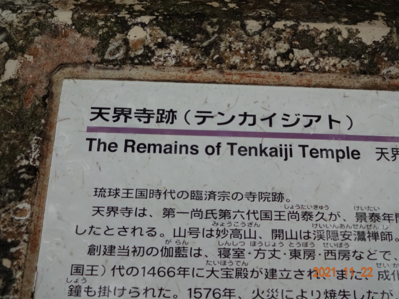 帰宅してから調べてみたら、天界寺は、第一尚氏第六代国王尚泰久が、1450年頃に創建したお寺で、かっての寺域は、この表示のある周辺、約1,080坪余だったとか。