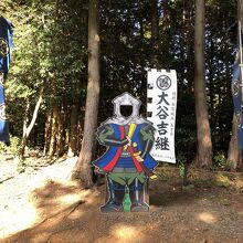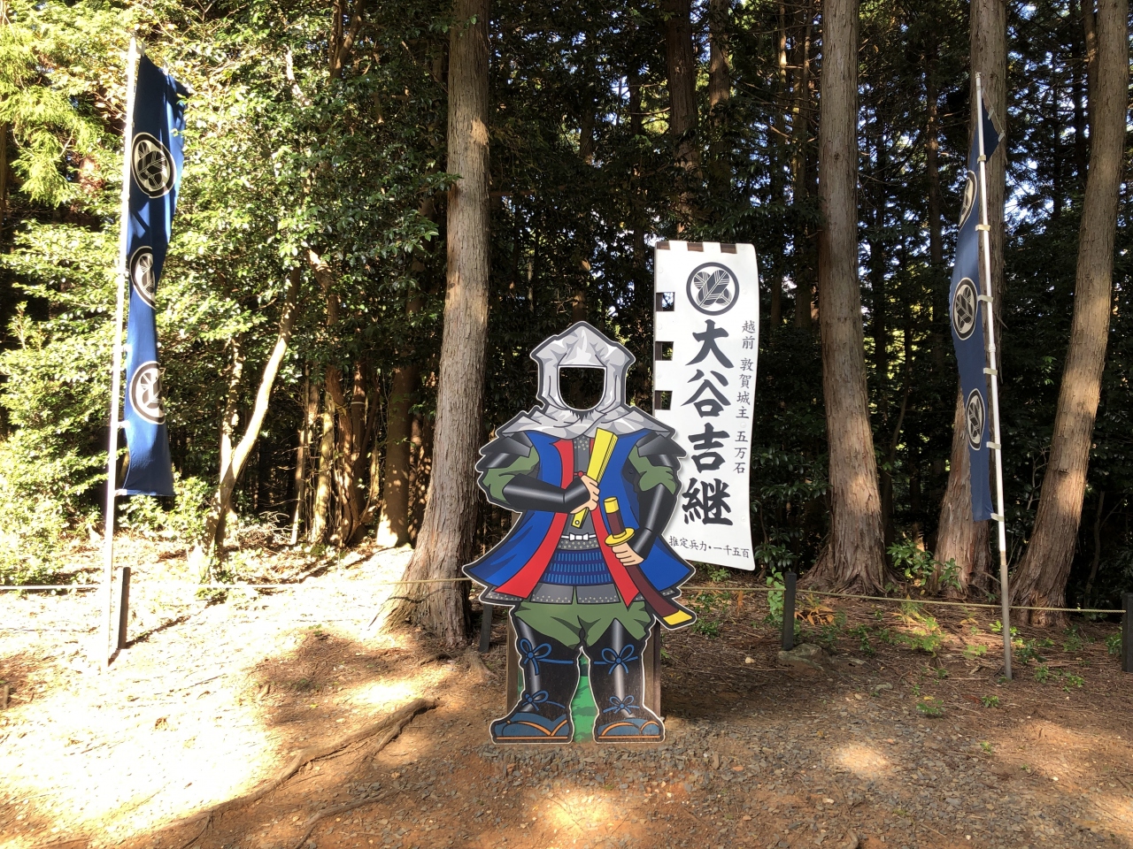 大谷吉継は、馬にも乗れぬ程の重病を押して参戦しました。陣跡へのアクセスは歩きのみです。麓の広域農道から約10分の登りでまず大谷吉継の墓所に到着します。そこから少し下るように更に5,6分進むと陣跡に出ました。国道を挟んだ松尾山は、裏切った小早川が陣を張った山です。この山をしっかり見渡せる展望所もありました。最終的に自害することになりますが、最後まで睨みを利かせた吉継の意気込みを感じる場所です。