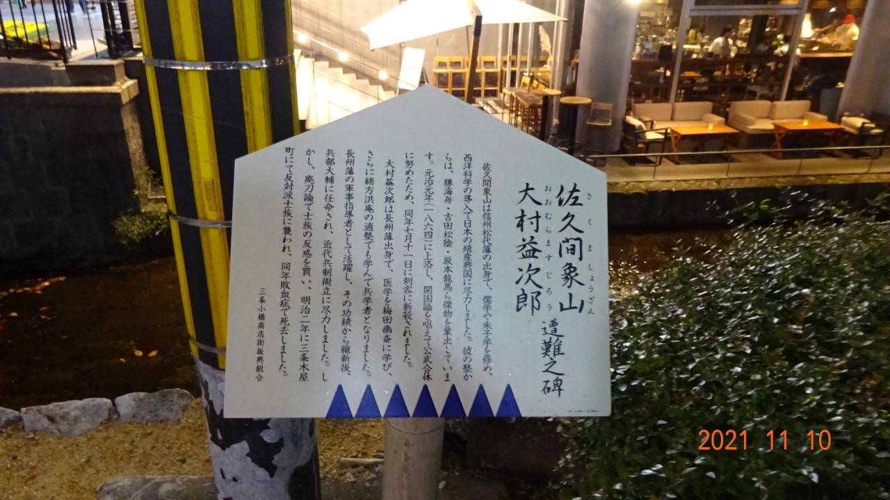 木屋町通を北に進むと、高瀬川沿いに佐久間象山 大村益次郎遭難の碑があります。