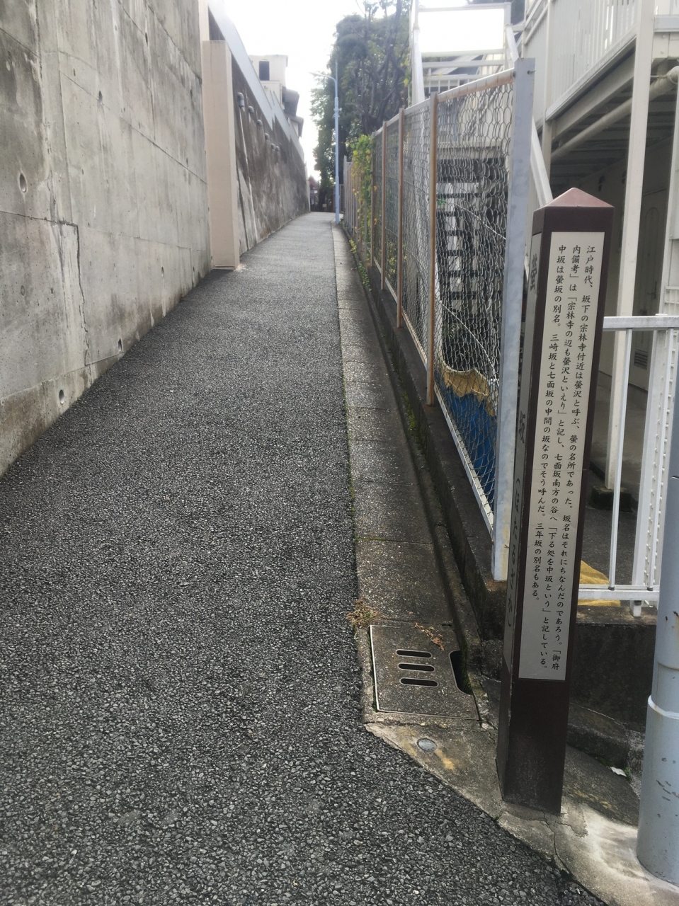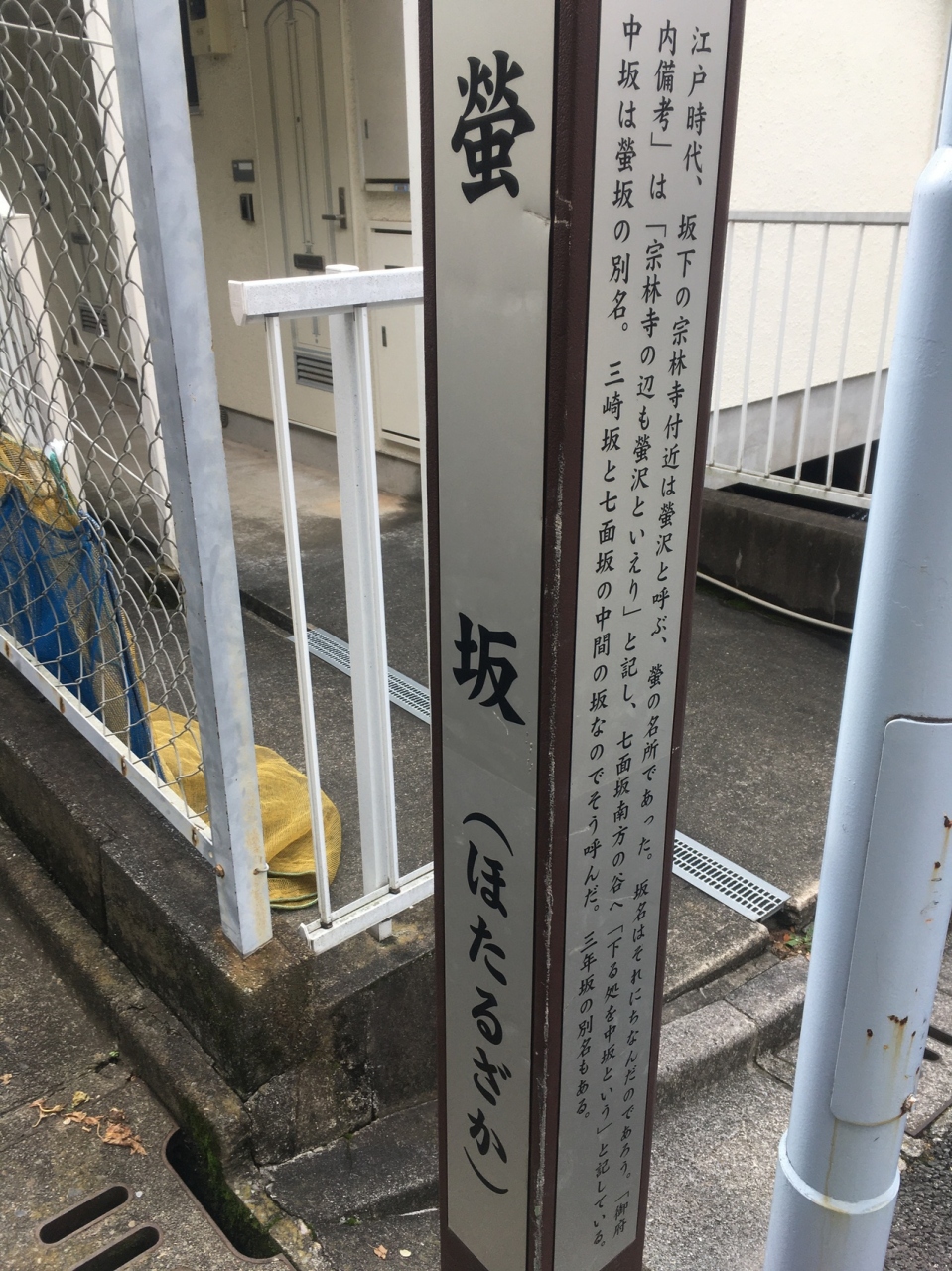谷中の観音寺築地塀の道を本立寺方向へ進むと細い下り坂があります。そのむかし坂下に宗林寺というお寺があり、付近には蛍が飛び交う沢があったことから「蛍坂」という名前がついたそうです。「三年坂」という別名もあるとか。坂を下ったところに説明標識が立っています。谷根千にはこのような坂が多くありそれぞれ名前の由来を知ることで歴史が分かり興味深いです。