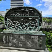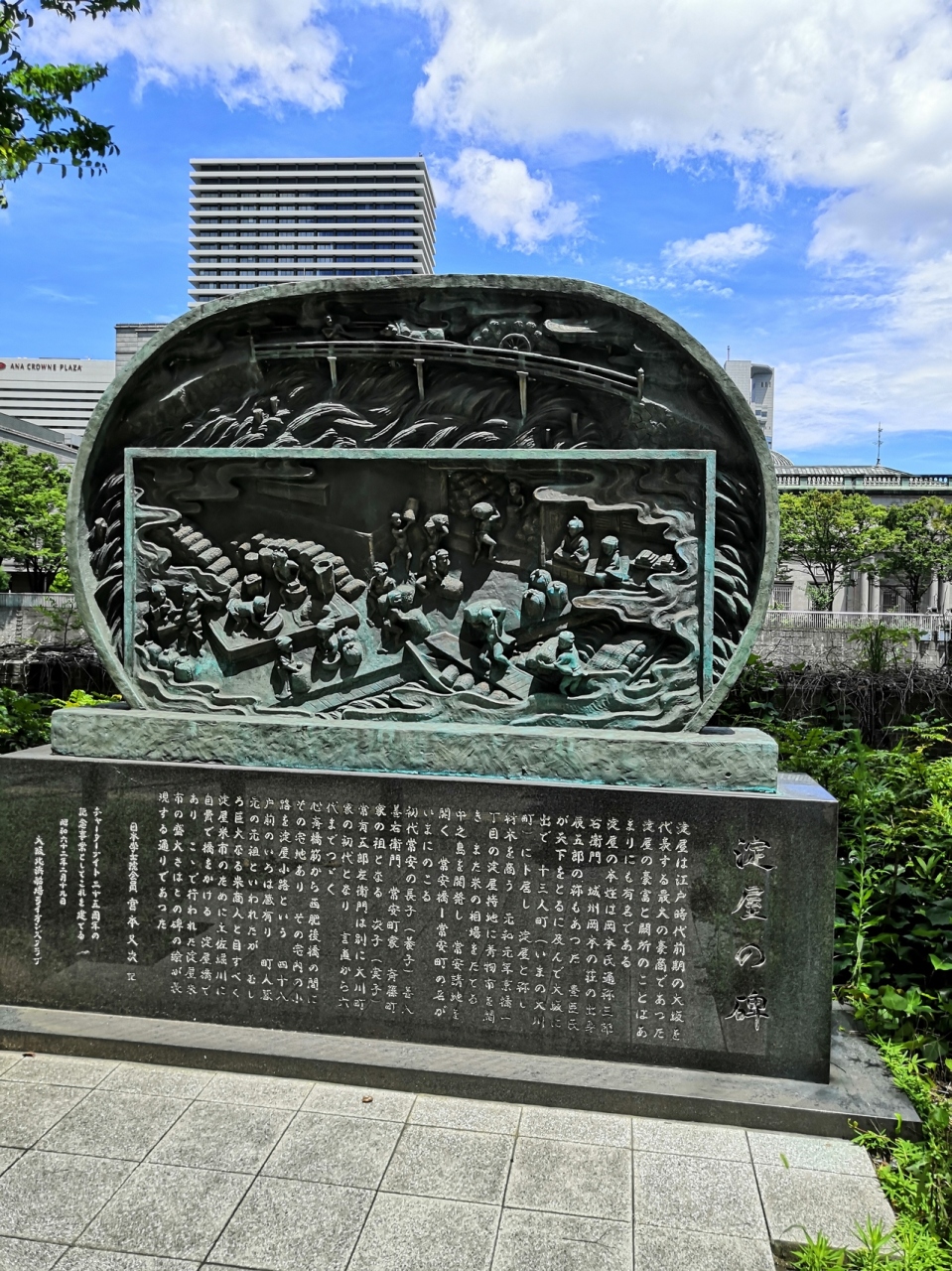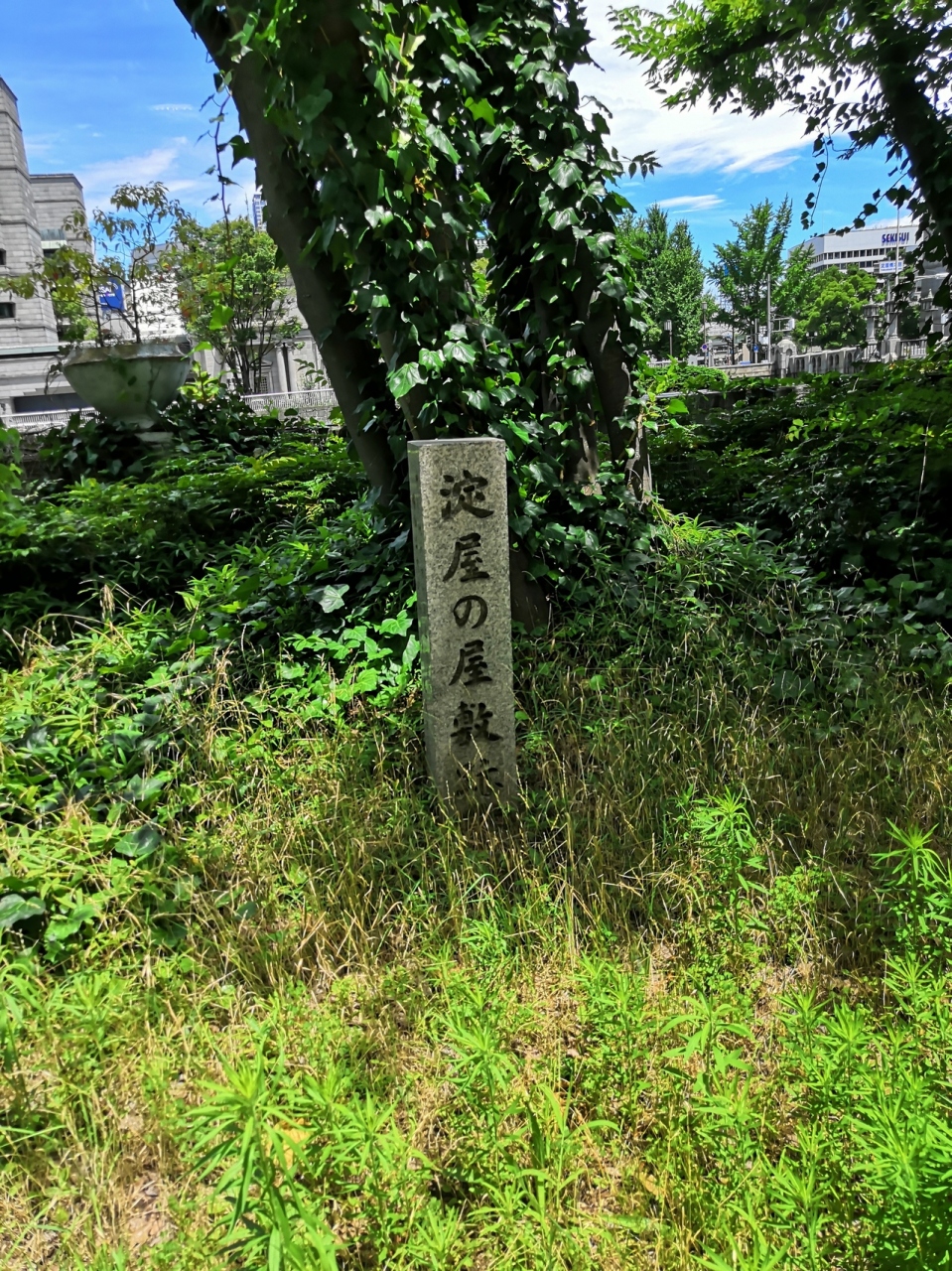淀屋橋駅から少し西に行ったところにあります。大阪の豪商であった淀屋の屋敷があった場所で、心斎橋筋から御霊筋付近にまで伸びており、その広さはなんと約1万坪あったそうです。屋敷跡の石碑は地味ですが、淀屋の碑とというレリーフは立派でした。