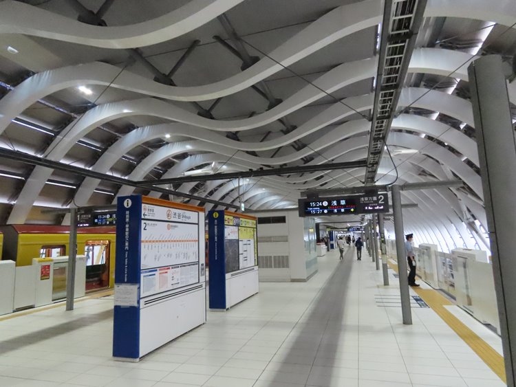 東京メトロ銀座線は渋谷から浅草までを結ぶ路線。開業は1927年(昭和2年)と日本で最初の地下鉄路線。トンネル断面が小さいので車両も小さく、車両上部ではなく軌道の間にある第三軌条から電源をとっている。東京メトロ他線とは互換性がなく直通運転も行われてないが、例えば表参道や赤坂見附では、それぞれ半蔵門線、丸ノ内線と同じホームで乗換えができる。渋谷の再開発によって銀座線渋谷駅は明るく広い駅になり昔のイメージががらっと変わりました。