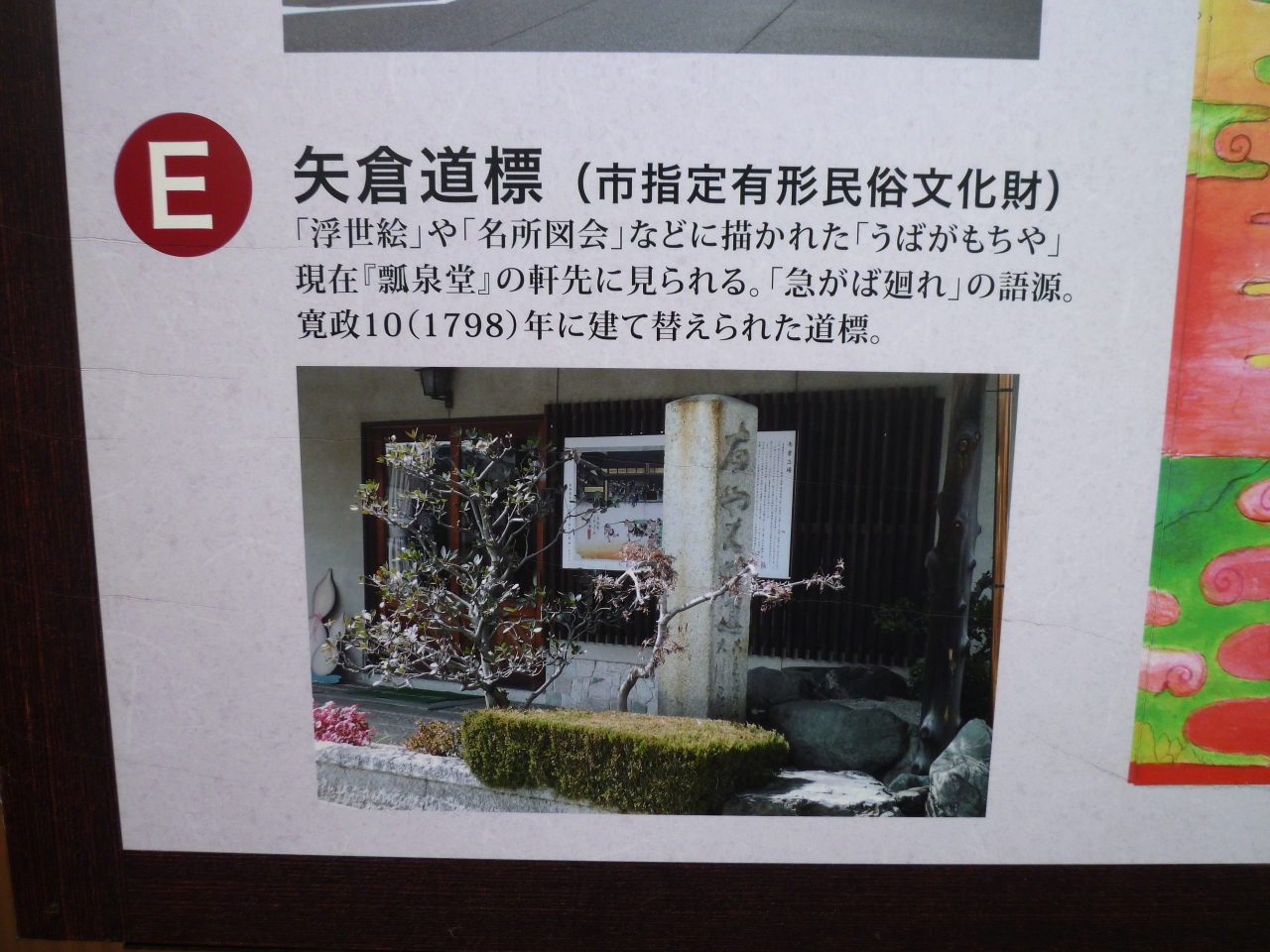 この道標は、歌川広重の描く浮世絵をはじめ、「東海道名所図会」や「伊勢参宮名所図会」などに紹介された「姥ケ餅屋」の軒先にも描かれています。江戸時代にここにあった「姥ケ餅屋」は明治になって移転したそうで、とても残念です。