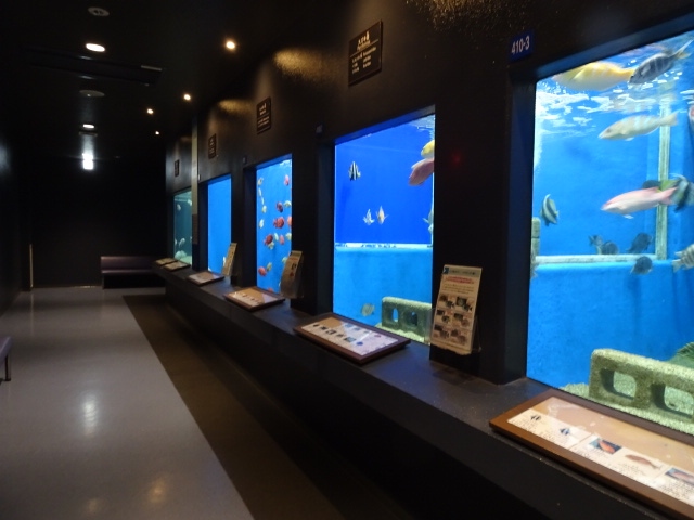 ここのところライトアップされた水族館を見慣れていたのでとても新鮮な感覚になれました。自販機で600円の入場料を購入。自動ドアが開くとそこには大きな水槽が。1mオーバーのGT浪人アジ、大型魚がお出迎えです。回遊水槽には、ほかの水族館にはありえない量のアジが回っていました。小さい水槽にはそれぞれ説明文がありそれほど広くないのにあっという間に1時間たってしまいました。