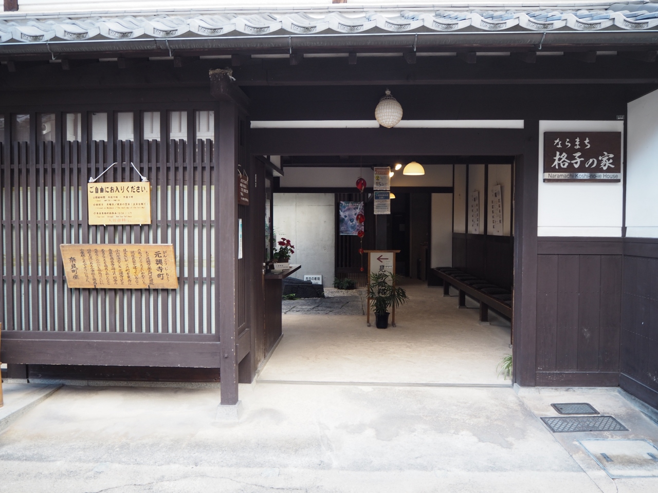 ならまち格子の家はならまちの南の端にある建物です。格子の家は江戸時代の末期に建てられていた町家を再現されたもので、無料で見学できます。建物内は奥行きがあり、畳の上にも登れます。かつての日本の民家はこのような感じであったのがわかり興味深いものがあります。落ち着いた感じで、住み心地もよさそうです。