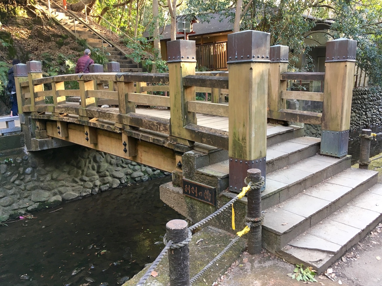 利剣の橋という木造りの小さな橋の左手に滝があり、その奥にお堂がありました。