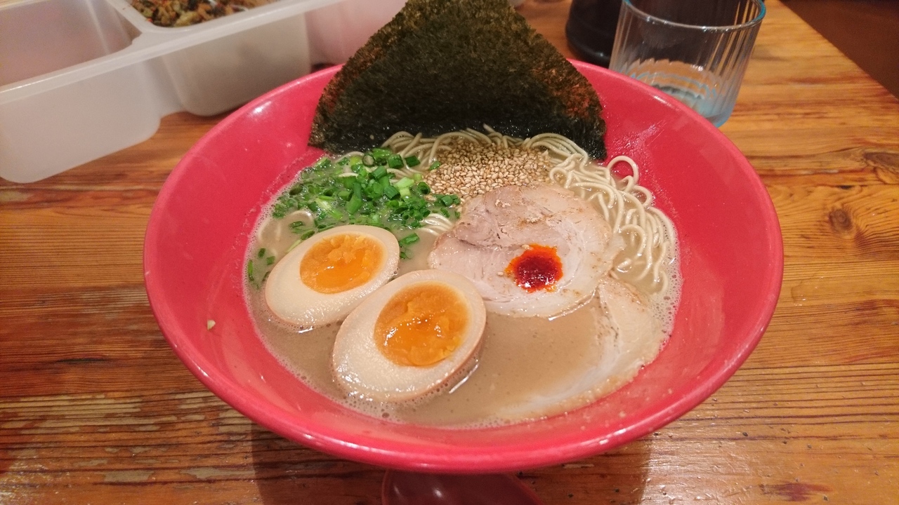 日曜の夕方に行くと数人の行列ができていました。店内は活気があって雰囲気良く、家族連れも多くて小さなお子さんがいても居やすいと思います。とんこつラーメンはテーブルごとに置かれる数種類のトッピングで味変でき、飽きずに食べられます。外側カリっとにんにく醤油の効いた唐揚げも美味しかったです。