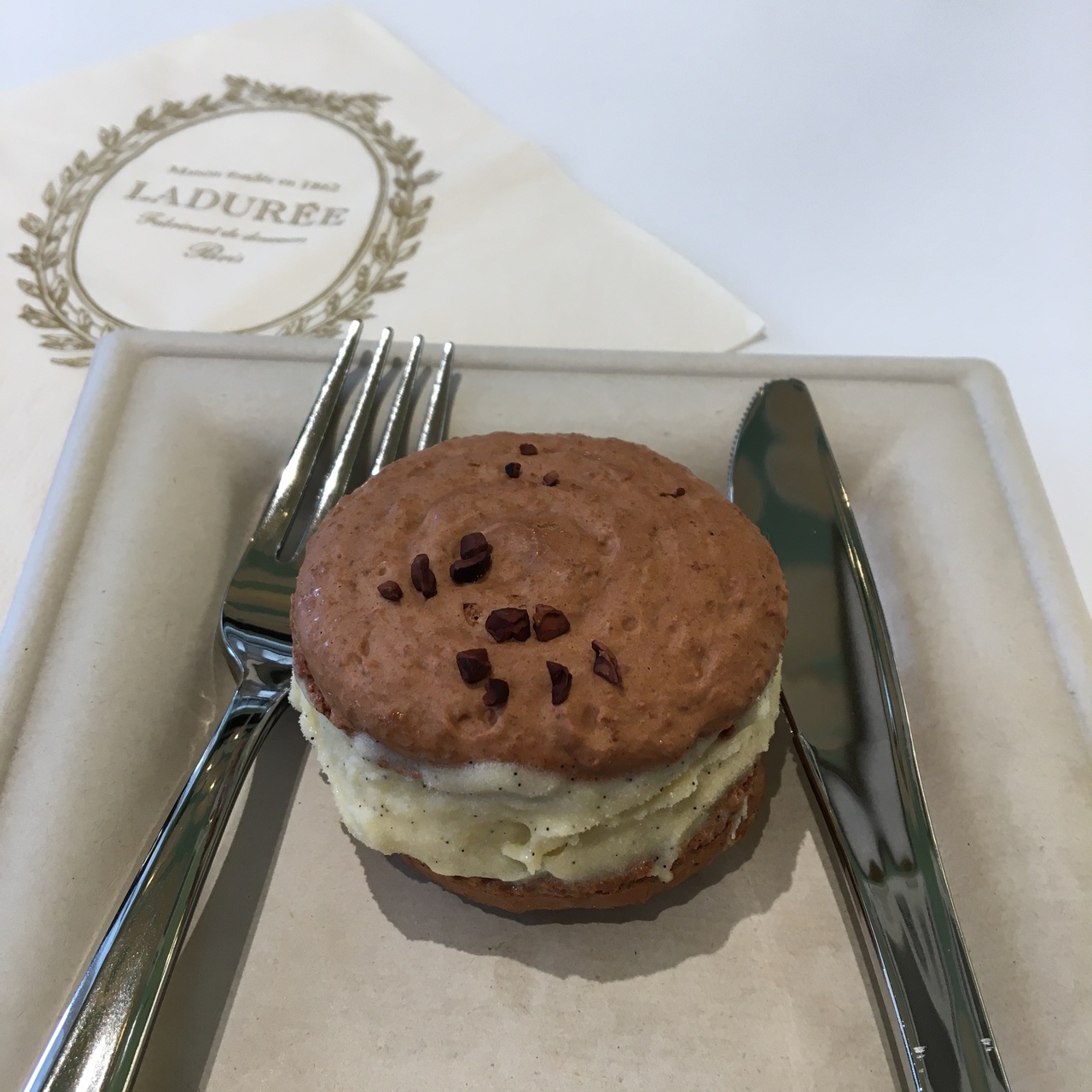 御殿場プレミアムアウトレット内にあるラデュレのショップです。店内にイートインスペースもあります。マカロン・アイス ショコラ・ヴァニーユ(599円)をいただきました。ショコラのマカロンでアイスクリームがサンドされています。イートインだと、プラスチックのナイフとフォークが付いてきたのですが、食べにくかったのでそのまま手で掴んで食べました。