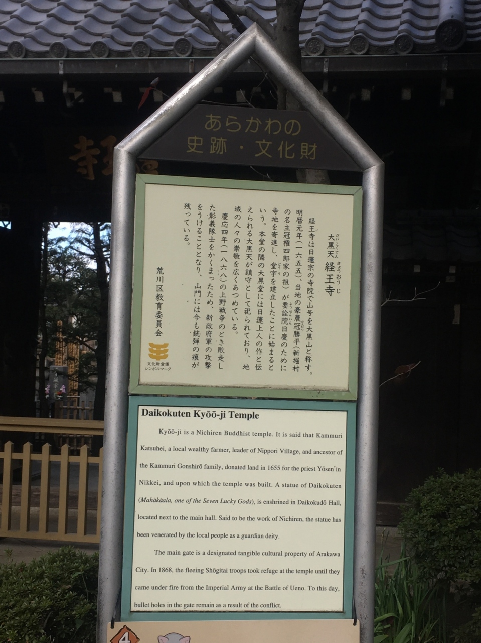 JR日暮里駅から御殿坂方面へ徒歩で5分ほどです。日蓮宗のお寺で境内はかなり広いです。大黒天堂には日蓮上人作と言われる大黒天像が祀られています。また1896年戊辰戦争の折、彰義隊がこのお寺に敗走します。追手の新政府軍の銃撃の弾痕が今も山門に残っているのです。歴史の生々しい跡を見ることができます。
