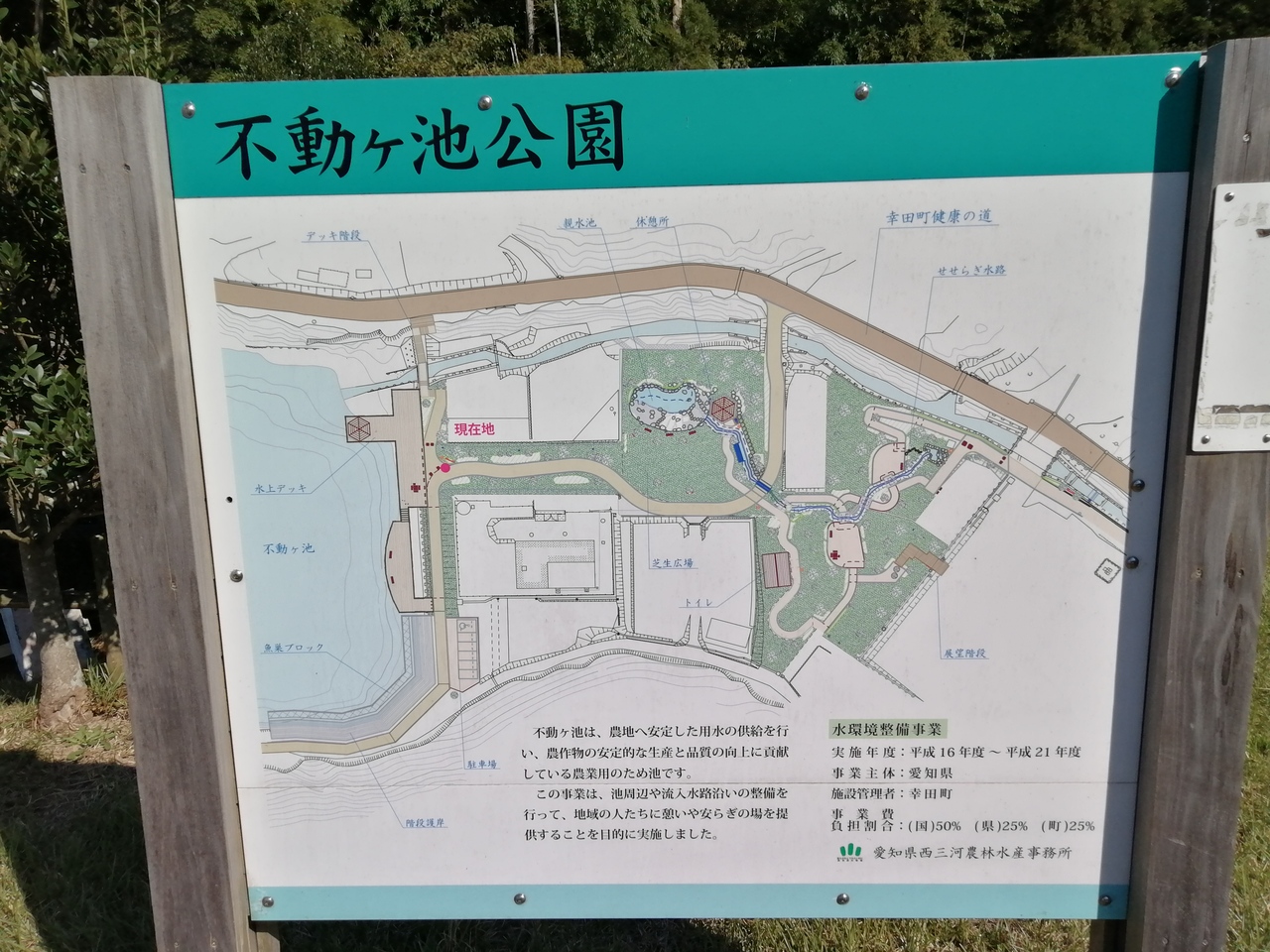 幸田町の「とぼね運動場」から遠望峰山に登っていく途中にある公園です。おそらく上流にある「不動ヶ滝」にちなんで名付けられたのだと思います。園内はきれいに整備されていて滝から流れる水路もあり夏は水遊びができそう。また大きな貯水池も隣接、池に張り出したウッドデッキからは眺めもよく、開放感抜群でとっても気持ちいい所です。公園と合わせてのんびりくつろげると思います。