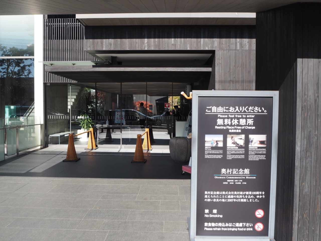奥村記念館は奈良国立博物館の斜め前、氷室神社のすぐ近くにあります。奥村建設が創立100周年を記念して造った建物で、新しくきれいな建物です。奥村建設の広報、宣伝のスペースになっています。無料で休憩が出来、またトイレもあります。広報、宣伝としては価値がある利用の仕方と思います。