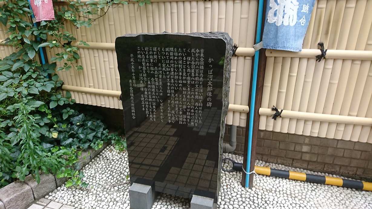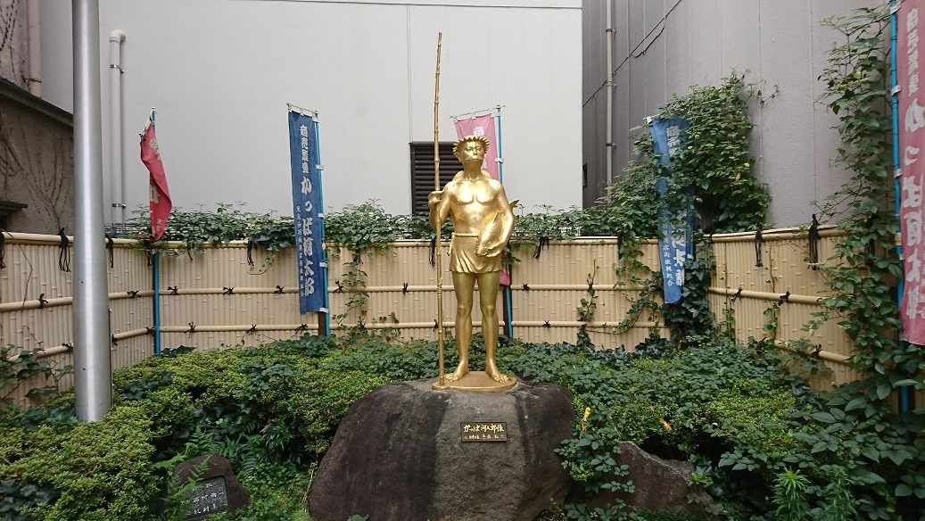 台東区松が谷2丁目の合橋交差点近くに河童像が立っています。合橋道具街誕生90周年を記念して平成15年(2003年)に立てられました。金色のせいか?お世辞にも可愛いとは言いがたく、子供たちにとっては怖い妖怪のように映っているかもしれません。