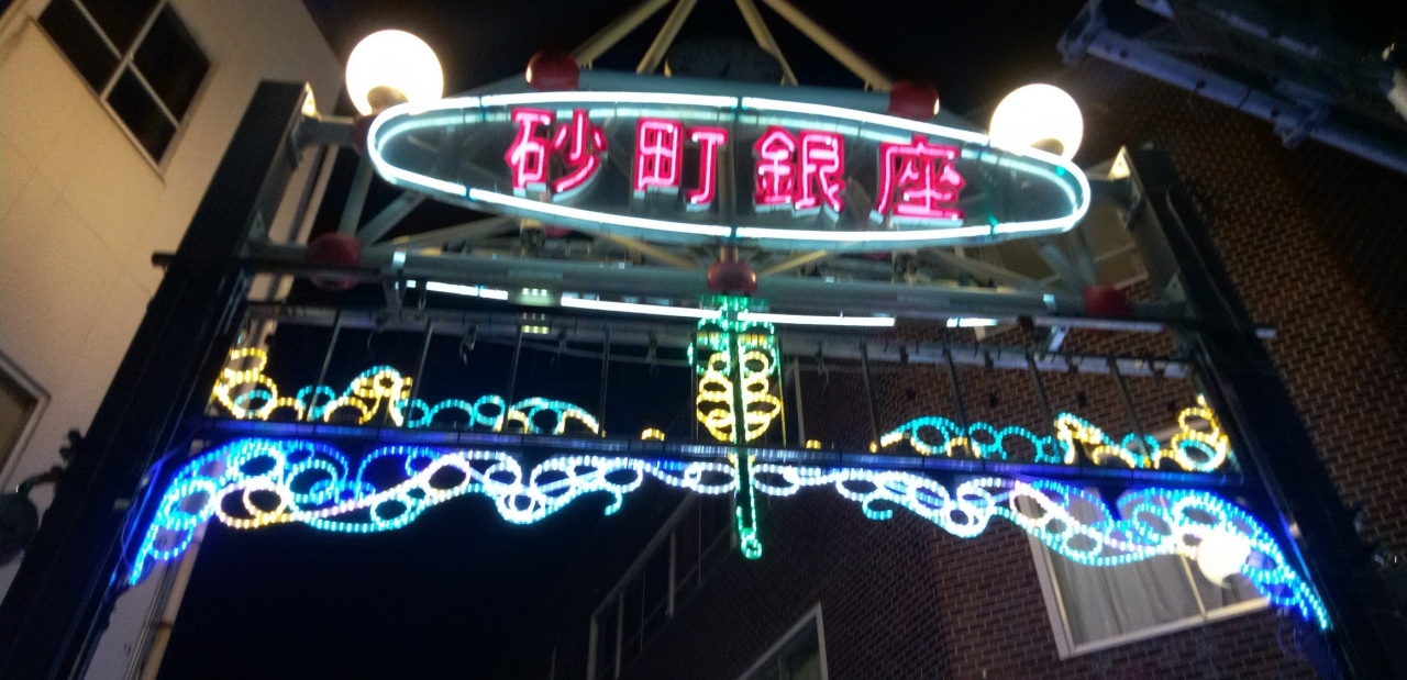 夕方薄暗くなってから、江東区の砂町商店街を訪れました。商店はそろそろ店じまいを始めている様子でしたが、年末が近いからでしょうか、商店街の入口案内が、きれいなイルミネーションのサインになっていたのに驚きました。下町の商店街ですが、夕方の通りも照明が華やかでとても良かったです。