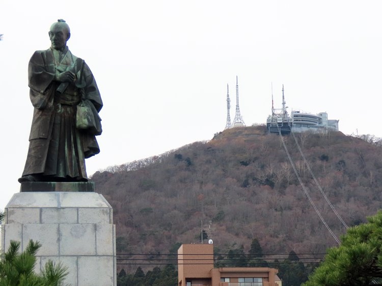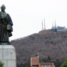 護国神社の坂の入り口に「そびえる」函館の恩人の像