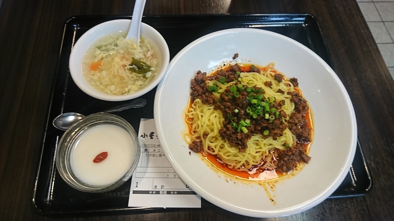 八丁堀駅出てすぐ、鍜治橋通り沿いにある中華料理屋さんです。ランチで中華スープと杏仁豆腐の付いた汁なし担々麺ランチセットをいただきました。具はたっぷりの肉ミンチとネギで、中華縮れ麵とラー油の混ざった濃い味のタレの一品です。辛さや痺れはほとんど感じず、味の濃さが目立っていた印象です。最後は自分で辣油を大量にかけて辛さUPしてから完食しました。