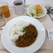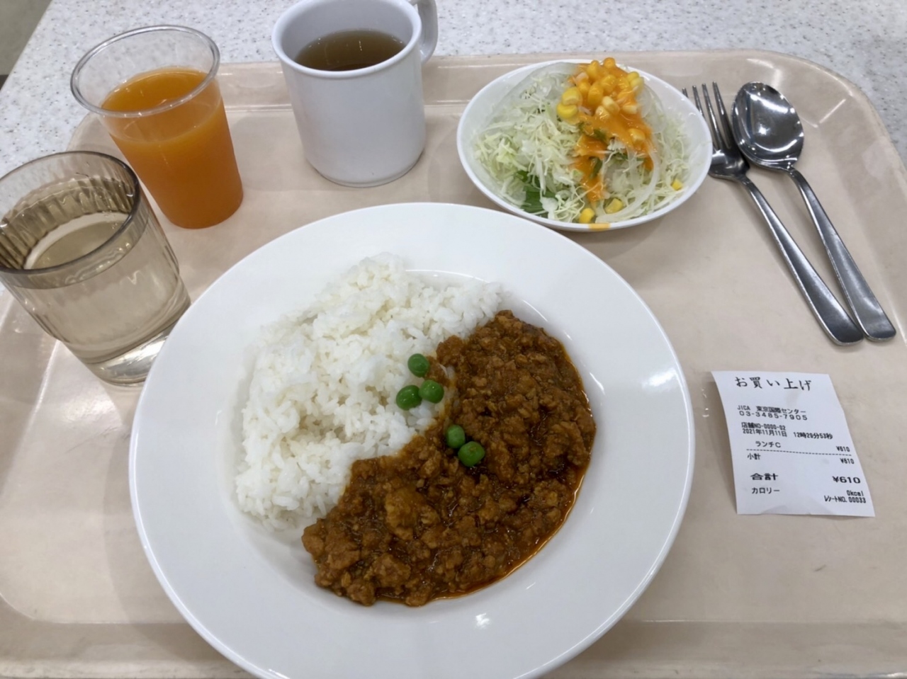 一般人も利用できます。週替わりのランチセットが3種類あり、その中から今回はCセットをチョイス。キーマカレーのセットでした。本格的なお味で自分にはかなり辛く感じました。それでも610円ですから有難いです。