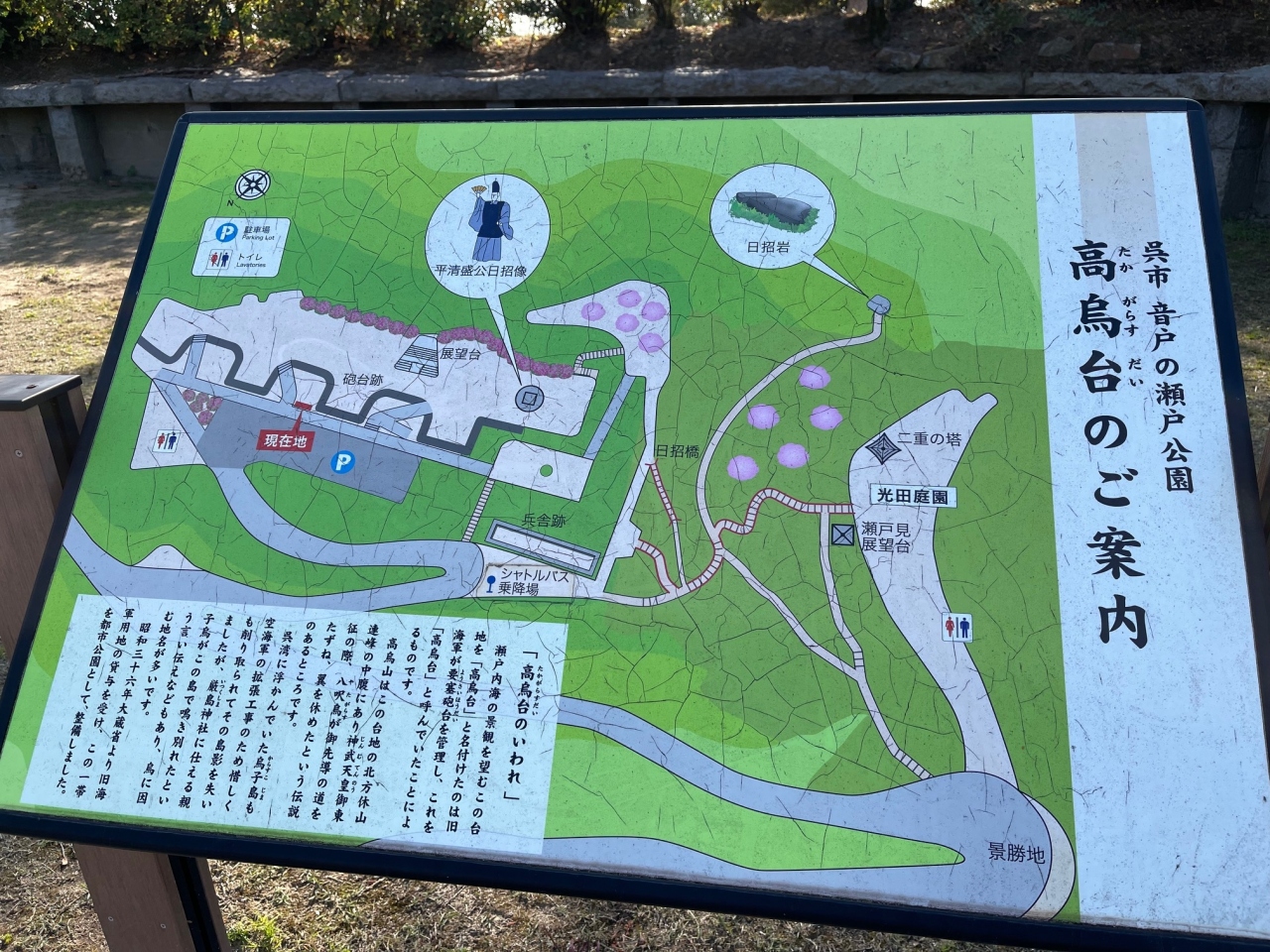 音戸の瀬戸へ行った際に立ち寄りました。広めな駐車場があり、トイレもあり、休憩に散策、秋は紅葉と展望を楽しみました。駐車場には自動販売機はありますが、公園内には売店などは一切ございません。展望がとてもよくて四国まで眺められました。