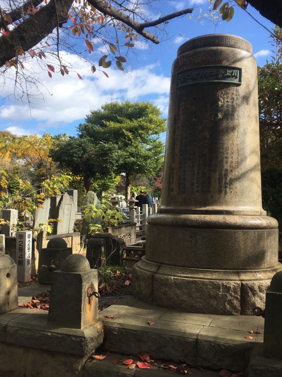 JR日暮里駅から徒歩で10分ほどです。谷中霊園の南側、さくら通りに面しています。円錐形の台座には「川上音二郎君の像」とあります。墓ではなく銅像の台座のみが残っているのです。像の部分は戦時下供出されたとか。音二郎は明治の新派俳優です。「オッペケ節」であまりにも有名ですが、改めてスケールの大きい人物だったことを知りました。墓は彼の出身地の博多にあります。