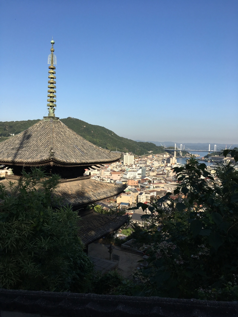 足利義詮の寄進でてきたお寺で本堂がある場所から、少し山を登ったところに天寧寺のシンボルとも言うべき三重塔が建っていて、ここからは市街地とその奥に広がる尾道水道を眺めることができ、まさに尾道を代表する風景になっていました。