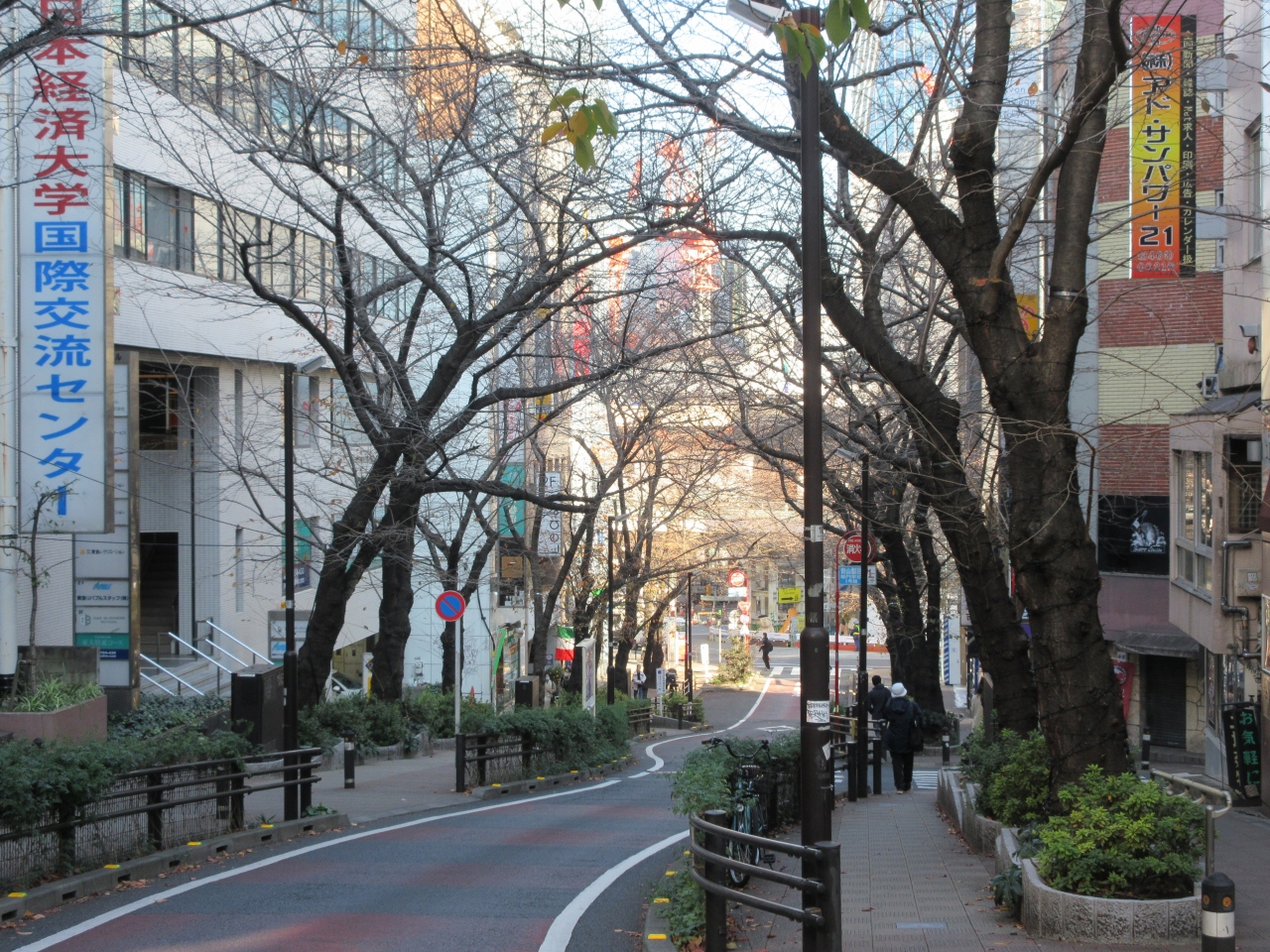 JR渋谷駅西口から5分ほど、文化総合センター大和田に向かう、150mほどの急な坂道です。道の両側にはマンションや飲食店が建ち並び、歩道には桜が植えられ桜の季節はとてもきれいです。葉が落ちた冬場は桜の木にLED電球が巻き付けられライトアップされ、さくら坂イルミネーション写真コンクールも開かれます。寒い冬を華やかにしてくれる坂道です。