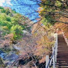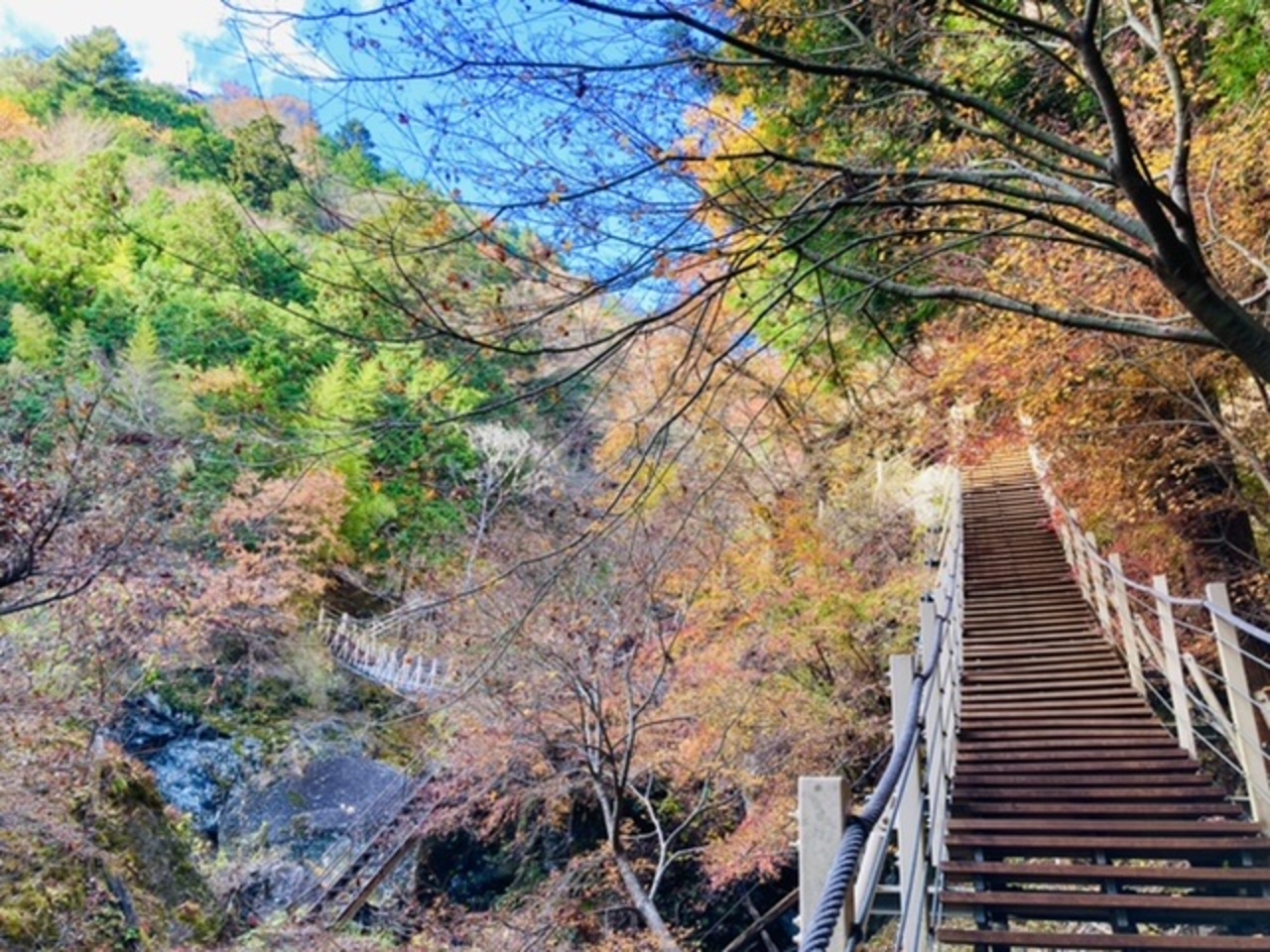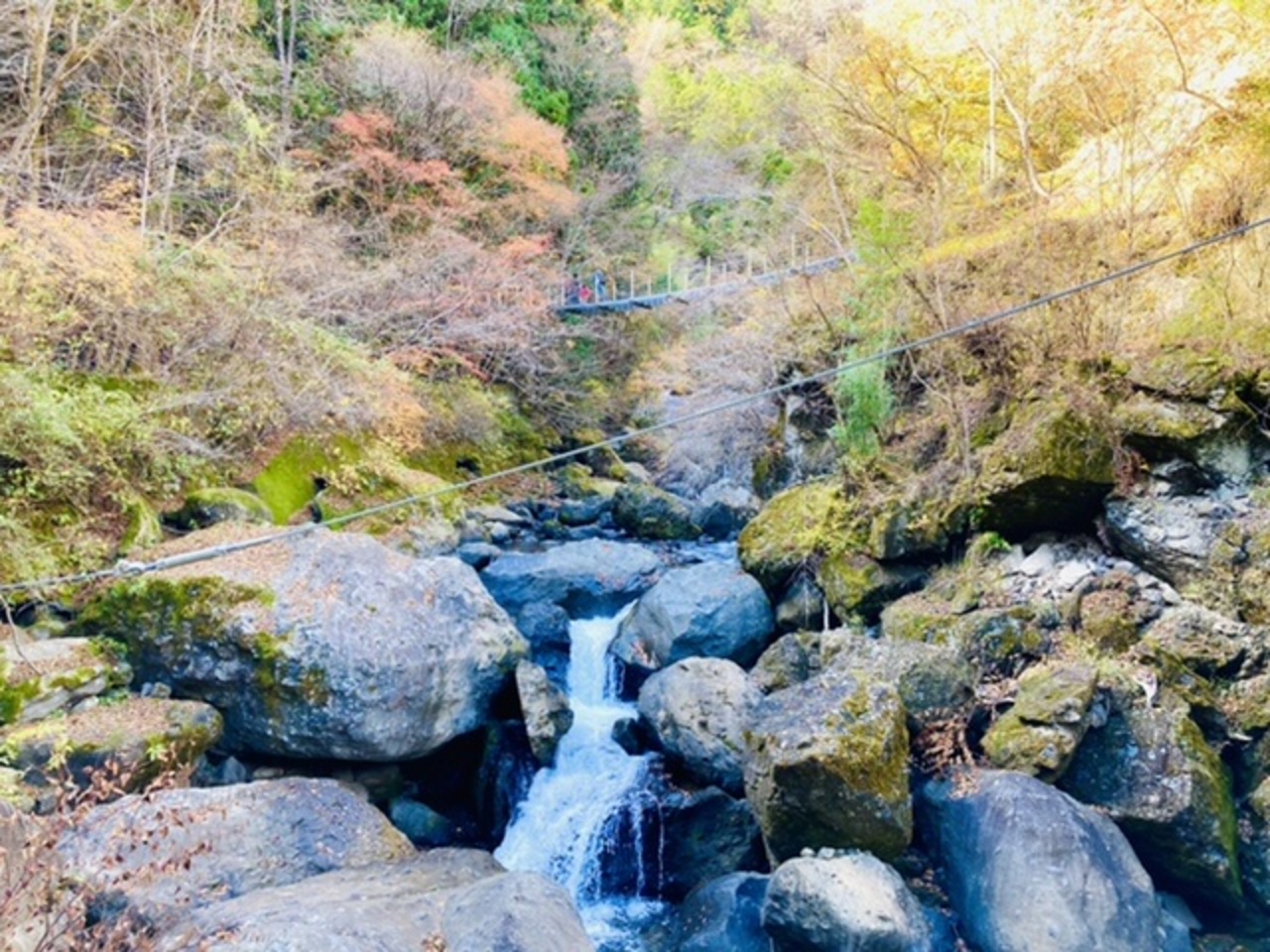 滝と吊り橋めぐりが楽しい美しい渓谷です。紅葉の時期には少しずれてたので、ほとんどが落葉してましたが、紅葉季節はもっときれいだと思います。人も少なかったので混雑感もなく、90分くらいで渓谷沿いのハイキングを楽しめました(つくたべ館から源氏の湯まで往復)。自然に触れたい、きれいな渓谷の景色と山歩きを少しだけ楽しみたい、という方にオススメの場所です。