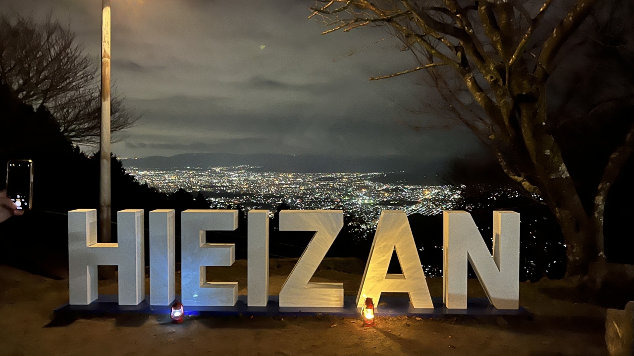 滋賀と京都の境目の比叡山。アクセス方法はいろいろありますが、八瀬から乗るケーブルカーは風情があって非常によいものです。夜景もご覧の通り非常に綺麗です。BE KOBEのような地名入りの置物もありました。山中は暗いのと段差がありました。